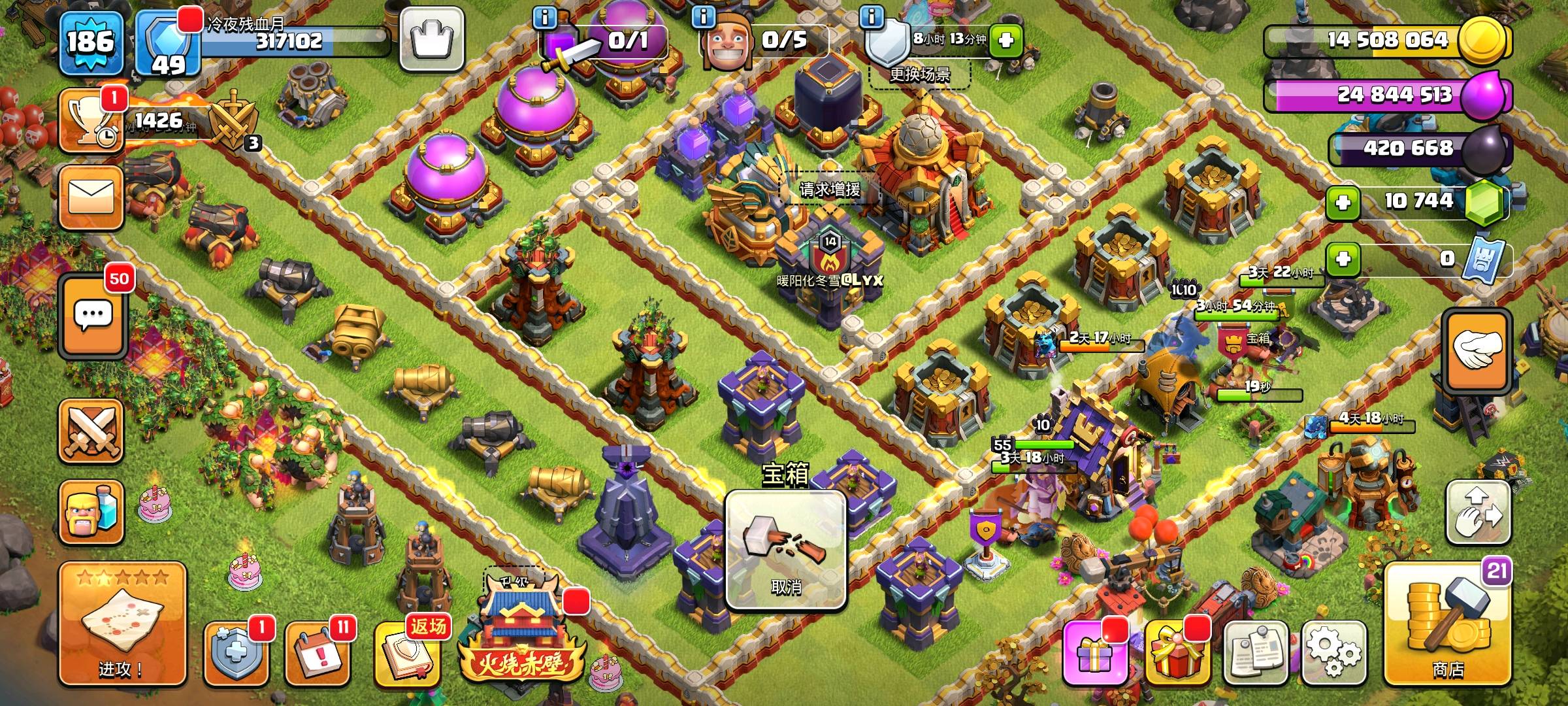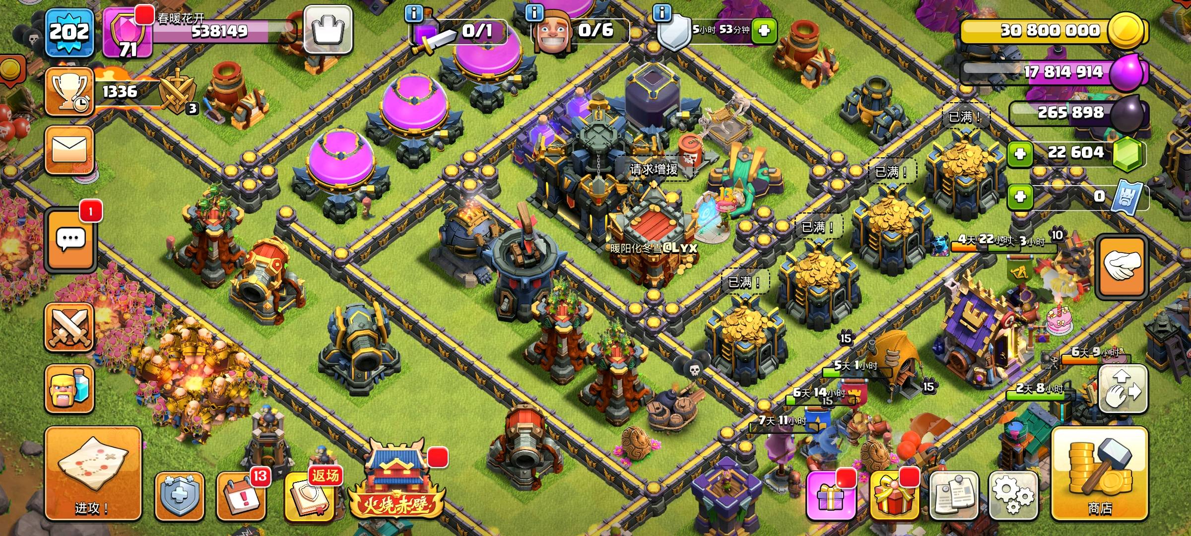 [代售]【部落冲突17本顶配账号“回眸一笑百媚生”出售】 17级大本营满配战力!蛮王71、女王72、飞盾战神72、咏王64、战神31,多只战宠高等级强力助阵;魔法物品库存豪华:部队之书1、法术之书1、升墙戒指25等多款道具强力加持发育。 大本营皮肤“大闹天宫·灵霄仙阙”国风拉满,英雄皮肤