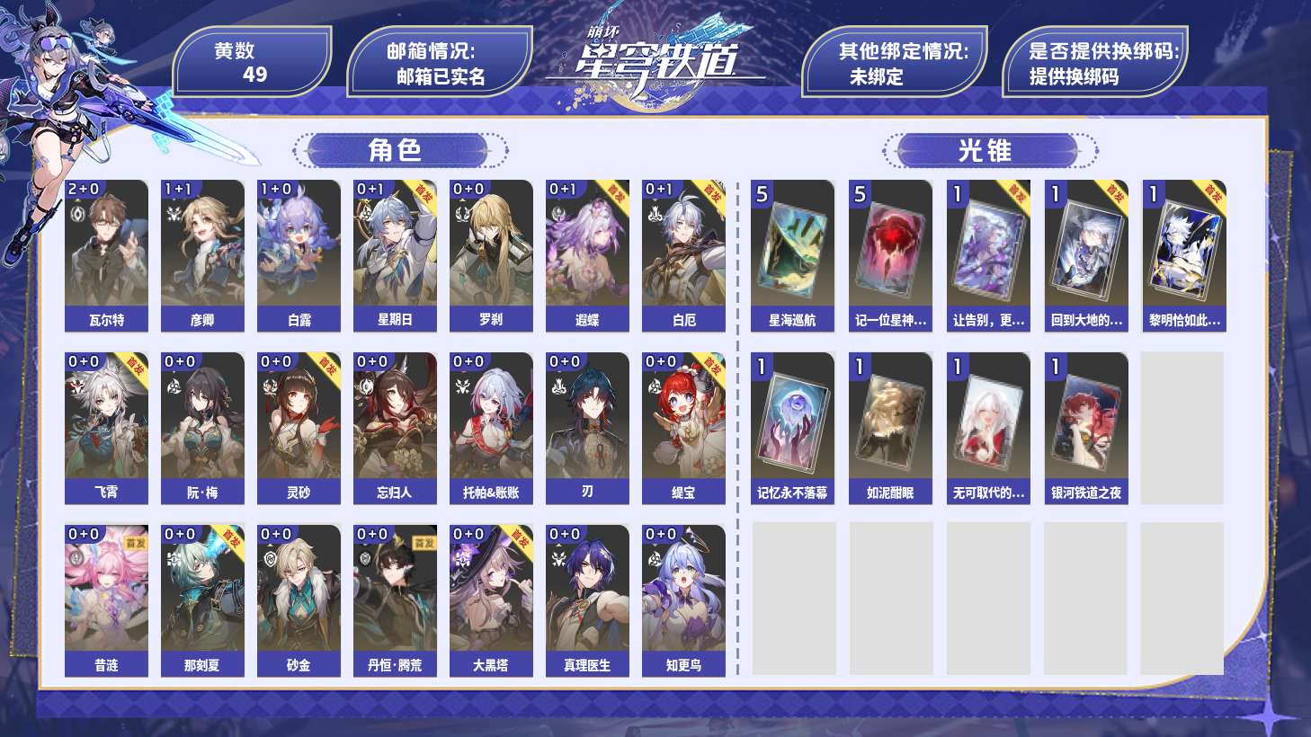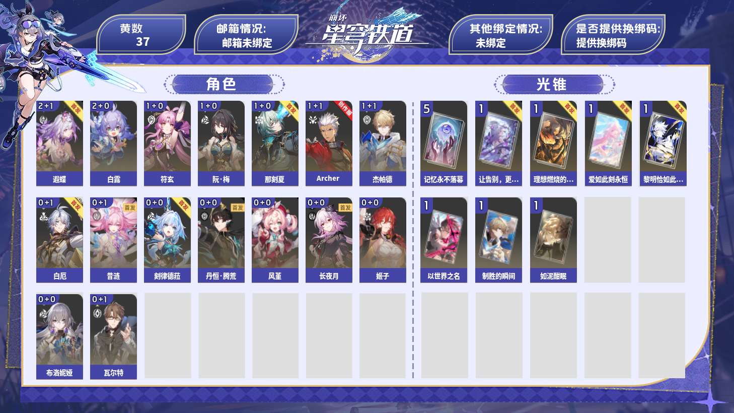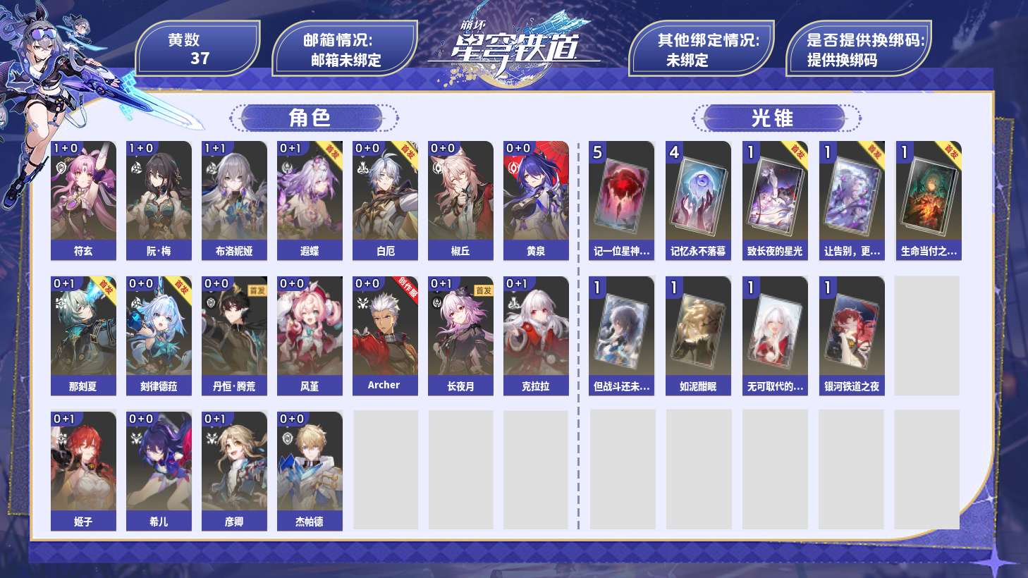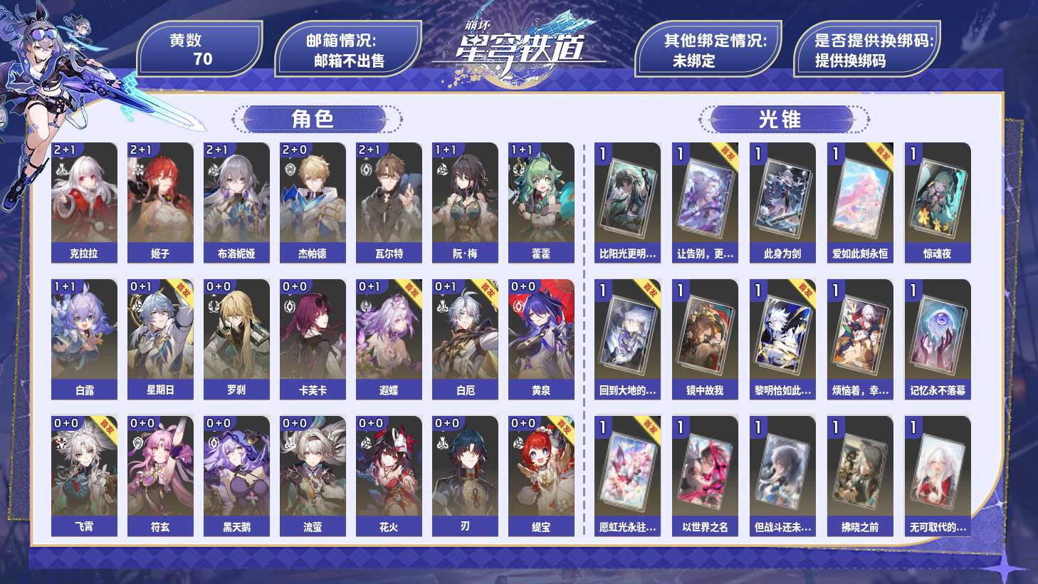 【崩坏·星穹铁道】【LYXQ6823】冒险等级:70,女主,五星数量:37,绑定情况:邮箱__五星角色:瓦尔特 * 2命|彦卿 * 1命|白露 * 1命|遐蝶|昔涟|星期日|丹恒·腾荒|白厄|知更鸟|忘归人|灵砂|托帕&账账|姬子|大黑塔|阮·梅|那刻夏|飞霄|藿藿|布洛妮娅|Saber|缇宝|Archer|真理医生|砂金|刃|克拉拉|杰帕德|罗刹__五星光锥:星海巡航 * 5精|记一位星神的陨落 * 5精|黎明恰如此燃烧|银河铁道之夜|回到大地的飞行|记忆永不落幕|让告别,更美一些|无可取代的东西|如泥酣眠,【邮箱已实名】