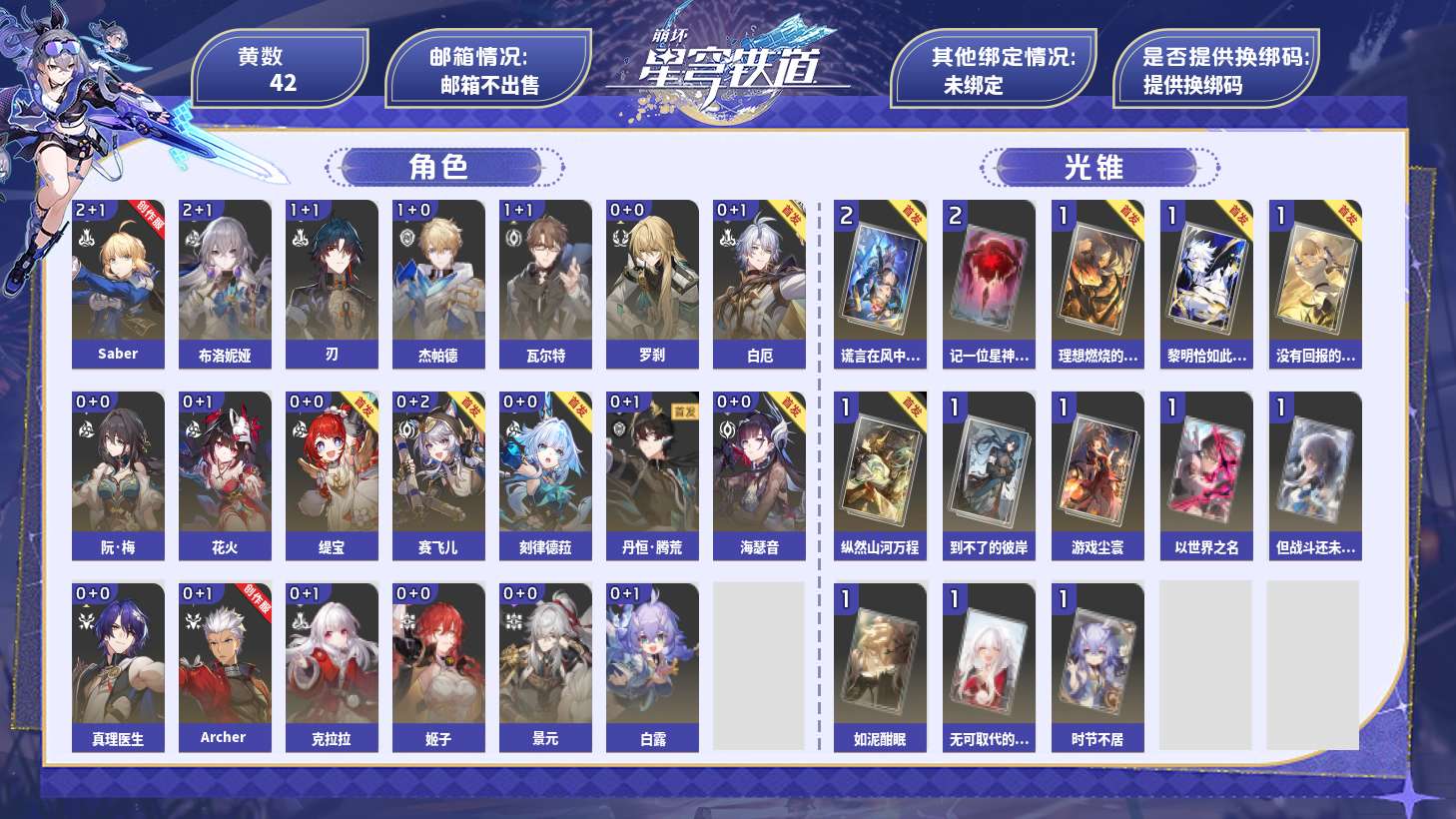 【崩坏·星穹铁道】【LYXQ6817】冒险等级:68,女主,五星数量:17,绑定情况:邮箱__五星角色:白厄 * 6命|Saber|阮·梅|刻律德菈|布洛妮娅|符玄|Archer|丹恒·腾荒|彦卿|杰帕德|真理医生__五星光锥:黎明恰如此燃烧 * 5精|记忆永不落幕 * 5精|时节不居 * 2精|无可取代的东西|理想燃烧的地狱|银河铁道之夜,【邮箱未】