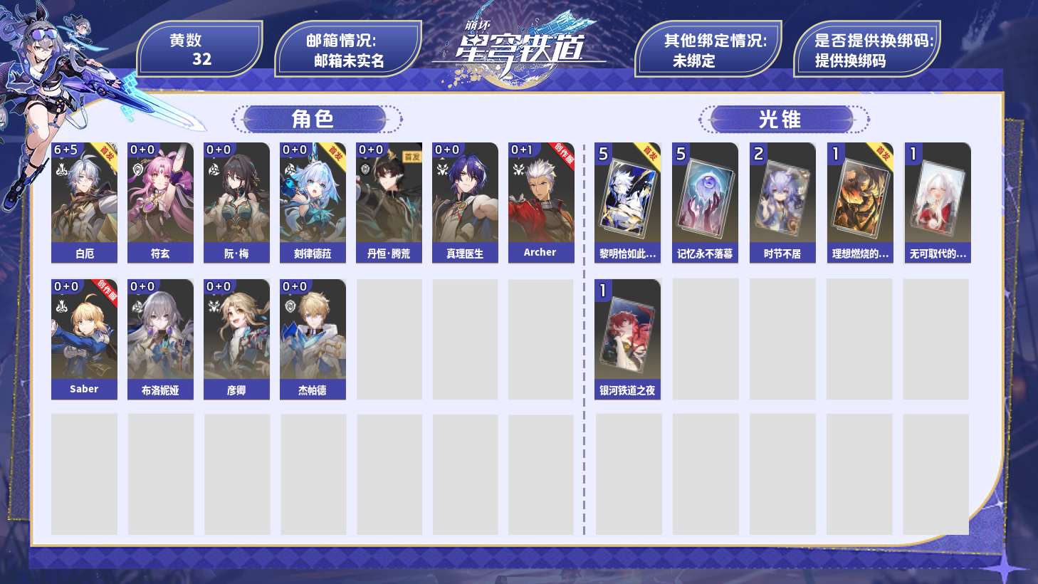 【崩坏·星穹铁道】【LYXQ6817】冒险等级:68,女主,五星数量:17,绑定情况:邮箱__五星角色:白厄 * 6命|Saber|阮·梅|刻律德菈|布洛妮娅|符玄|Archer|丹恒·腾荒|彦卿|杰帕德|真理医生__五星光锥:黎明恰如此燃烧 * 5精|记忆永不落幕 * 5精|时节不居 * 2精|无可取代的东西|理想燃烧的地狱|银河铁道之夜,【邮箱未实名】