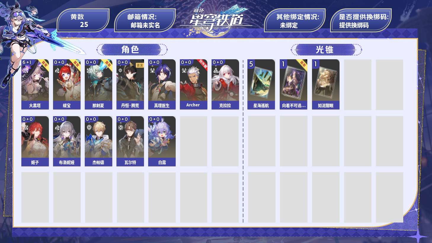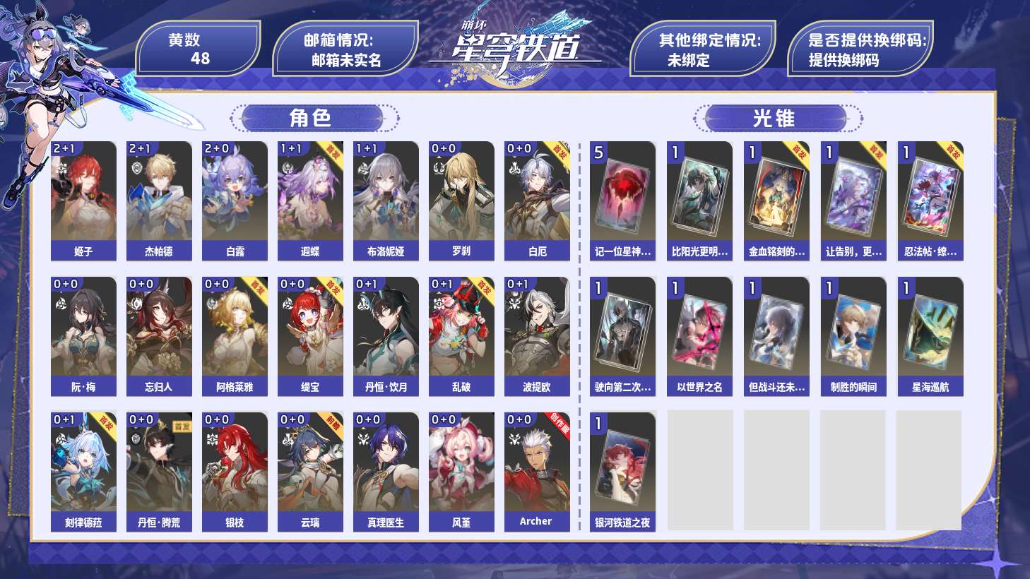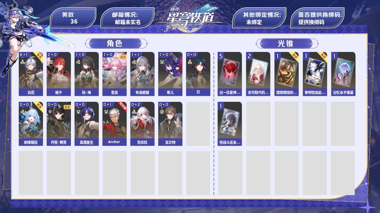 【崩坏·星穹铁道】【LYXQ6871】冒险等级:70,女主,五星数量:36,绑定情况:邮箱__五星角色:杰帕德 * 2命|白露 * 2命|姬子 * 2命|遐蝶 * 1命|布洛妮娅 * 1命|风堇|缇宝|长夜月|丹恒·腾荒|白厄|波提欧|银枝|忘归人|阮·梅|阿格莱雅|乱破|丹恒·饮月|罗刹|云璃|刻律德菈|Archer|瓦尔特|彦卿|希儿|真理医生__五星光锥:记一位星神的陨落 * 5精|比阳光更明亮的|驶向第二次生命|忍法帖·缭乱破魔|金血铭刻的时代|制胜的瞬间|让告别,更美一些|但战斗还未结束|星海巡航|以世界之名|银河铁道之夜,【邮箱未实名】星穹铁道 - 官服 -