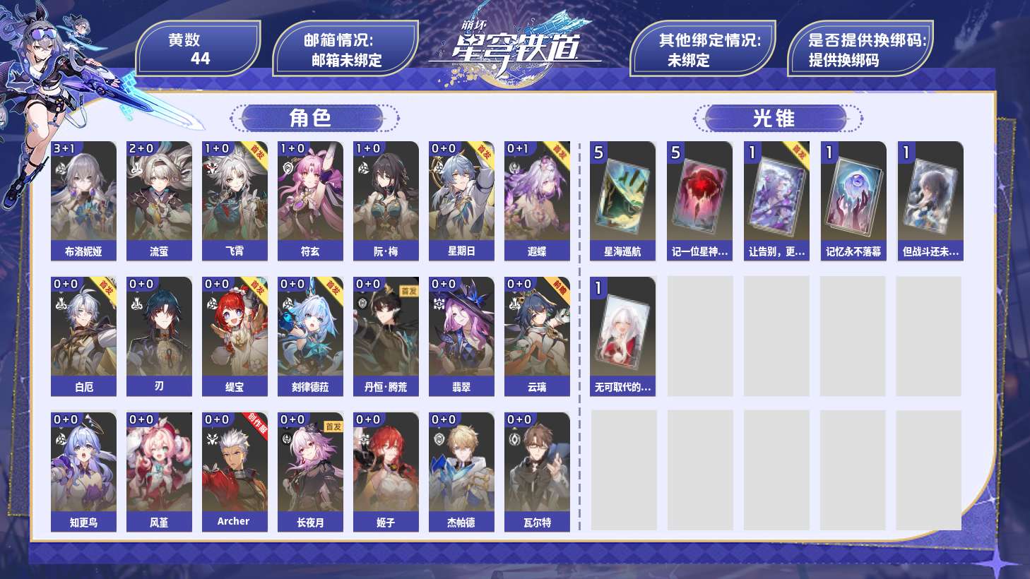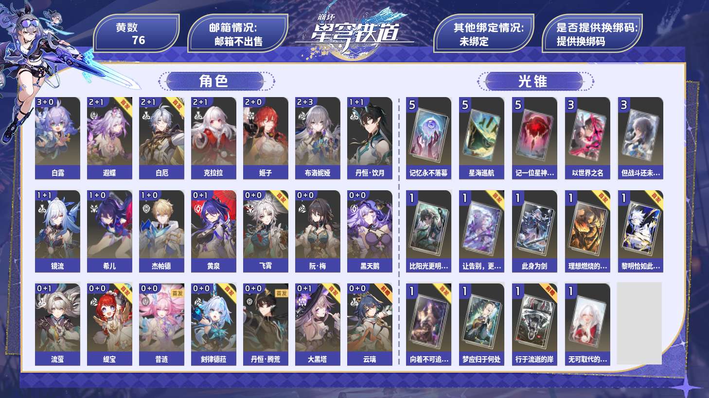 【崩坏·星穹铁道】【LYXQ6871】冒险等级:70,女主,五星数量:36,绑定情况:邮箱__五星角色:杰帕德 * 2命|白露 * 2命|姬子 * 2命|遐蝶 * 1命|布洛妮娅 * 1命|风堇|缇宝|长夜月|丹恒·腾荒|白厄|波提欧|银枝|忘归人|阮·梅|阿格莱雅|乱破|丹恒·饮月|罗刹|云璃|刻律德菈|Archer|瓦尔特|彦卿|希儿|真理医生__五星光锥:记一位星神的陨落 * 5精|比阳光更明亮的|驶向第二次生命|忍法帖·缭乱破魔|金血铭刻的时代|制胜的瞬间|让告别,更美一些|但战斗还未结束|星海巡航|以世界之名|银河铁道之夜,【邮箱未实名】