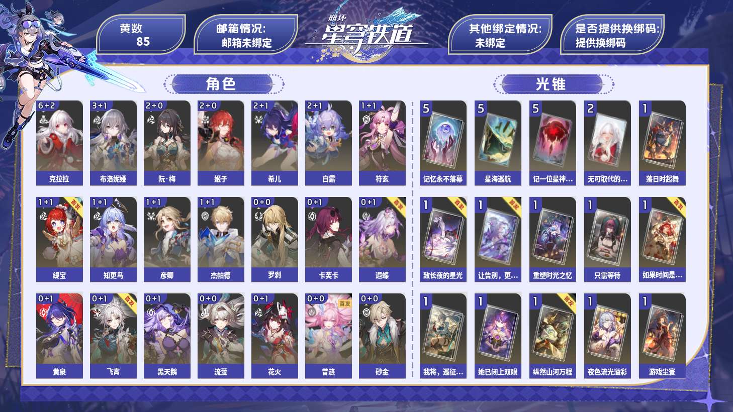 【崩坏·星穹铁道】【LYXQ6851】冒险等级:68,男主,五星数量:19,绑定情况:邮箱__五星角色:白厄 * 6命|姬子 * 2命|布洛妮娅 * 1命|昔涟 * 1命|阮·梅 * 1命|希儿 * 1命|刻律德菈|克拉拉|丹恒·腾荒|刃|Archer|真理医生|瓦尔特__五星光锥:记一位星神的陨落 * 5精|无可取代的东西 * 2精|黎明恰如此燃烧|理想燃烧的地狱|但战斗还未结束|记忆永不落幕,【邮箱未实名】