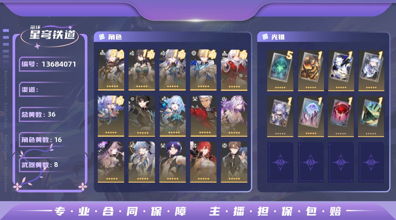 【崩坏·星穹铁道】【LYXQ6871】冒险等级:70,女主,五星数量:36,绑定情况:邮箱__五星角色:杰帕德 * 2命|白露 * 2命|姬子 * 2命|遐蝶 * 1命|布洛妮娅 * 1命|风堇|缇宝|长夜月|丹恒·腾荒|白厄|波提欧|银枝|忘归人|阮·梅|阿格莱雅|乱破|丹恒·饮月|罗刹|云璃|刻律德菈|Archer|瓦尔特|彦卿|希儿|真理医生__五星光锥:记一位星神的陨落 * 5精|比阳光更明亮的|驶向第二次生命|忍法帖·缭乱破魔|金血铭刻的时代|制胜的瞬间|让告别,更美一些|但战斗还未结束|星海巡航|以世界之名|银河铁道之夜,【邮箱未】