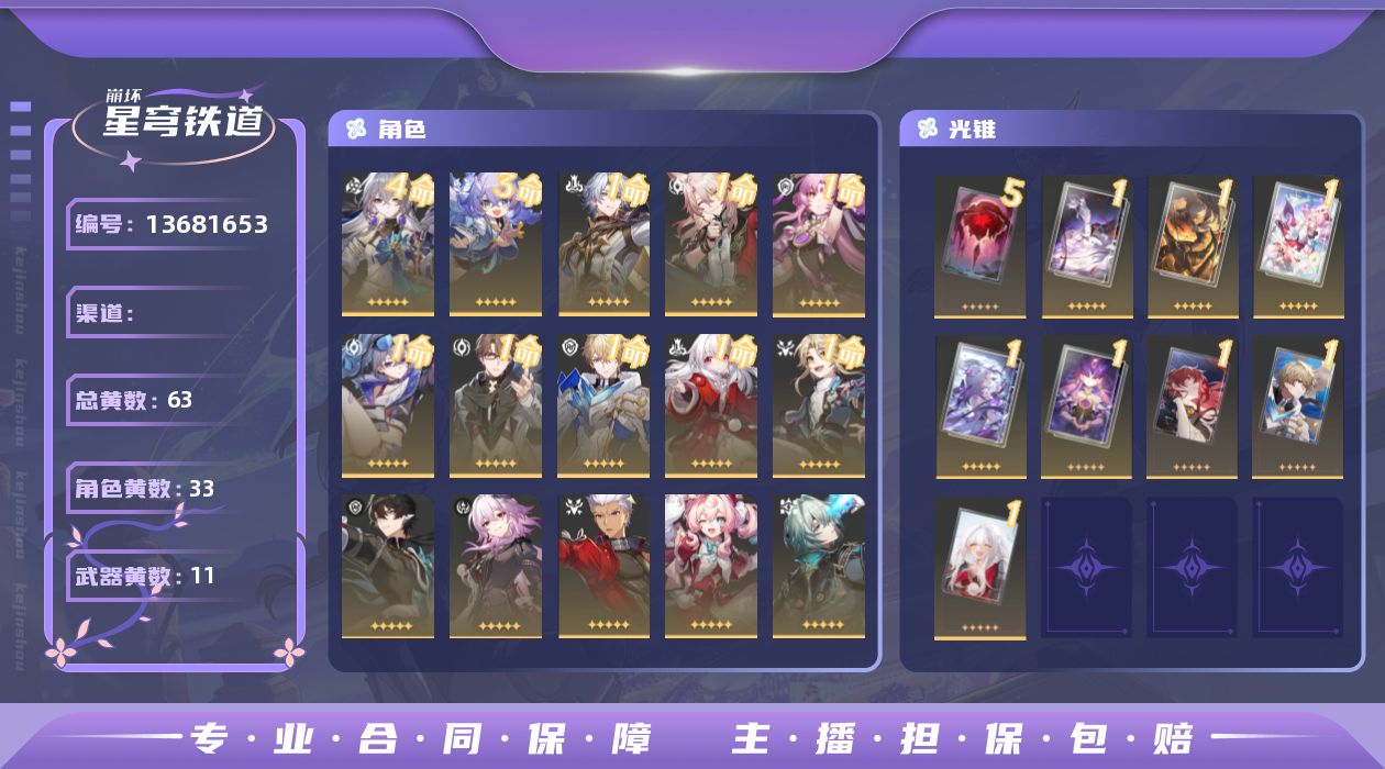 [13681653]m23844,70级,男主,63黄,梦华0,星琼743,星轨专票2,星轨通票1,33个五星角色:4命布洛妮娅,3命白露,1命白厄,1命椒丘,1命符玄,1命银狼,1命彦卿,1命瓦尔特,1命克拉拉,1命杰帕德,丹恒腾荒,遐蝶,长夜月,那刻夏,刃,星期日,丹恒饮月,知更鸟,阮梅,黄泉,景元,藿藿,花火,砂金,罗刹,Archer,姬子,真理医生,流萤,托帕账账,镜流,阿格莱雅,风堇,服饰:春日手信,冬去煦至,11个五星光锥:精5记一位星神的陨落,精1黎明恰如此燃烧,精1无可取代的东西,精1她已闭上双眼,精1制胜的瞬间,精1致长夜的星光,精1愿虹光永驻天空,精1让告别更美一些,精1银河铁道之夜,精1无可取代的东西,精1理想燃烧的地狱星穹铁道 - 官服 -