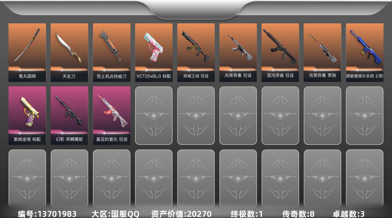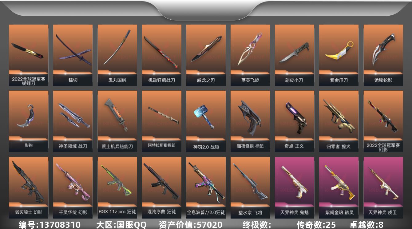【WYF2031】终极*8/传奇*2/卓越*1/皮肤*37/等级*88/段位:超凡/2025全球冠军赛套装/2022全球冠军赛套装/幻棱/炼狱/维斯/暮蝶/壹决/铁臂/捷风/幽影/不死鸟/贤者/猎枭/蝰蛇/零/芮娜/奇乐/尚勃勒/霓虹/夜露/星礈/K/O/盖可/黑梦/钢锁/近战武器-2025全球冠军赛 蝴蝶刀/近战武器-2022全球冠军赛 蝴蝶刀/近战武器-鬼丸国纲/近战武器-诡秘蛇影 军刀/近战武器-日耀风暴 遗器/狂徒-2025全球冠军赛/狂徒-盖亚的复仇/狂徒-诡秘蛇影/幻影-781-A协议/幻影-2022全球冠军赛/幻影-末日之翼/戍卫-折光棱晶/飞将-末日之翼/莽侠-诡秘蛇影/奥丁
