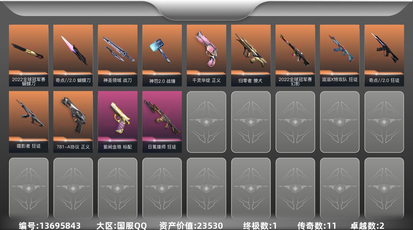 [13695843]11橙皮 1金皮 2紫皮 51皮肤 18英雄 67卡面 630已用源晶 未定级段位 【亮点皮肤】:幻影-2022全球冠军赛,蝴蝶刀-2022全球冠军赛 【套装】:2022全球冠军赛 【近战武器皮肤】:神圣领域 战刀,神罚2.0 战锤,蝴蝶刀-奇点//2.0 【佩枪皮肤】:正义-781-A协议,正义-千灵华绽,标配-紫阙金琅 【步枪皮肤】:狂徒-奇点//2.0,狂徒-滋滋X特攻队,狂徒-噬影者,狂徒-日冕雄师,獠犬-归零者 【挂饰】:薰衣草之心挂饰,神中神挂饰,FRGMTx皮蛋挂饰