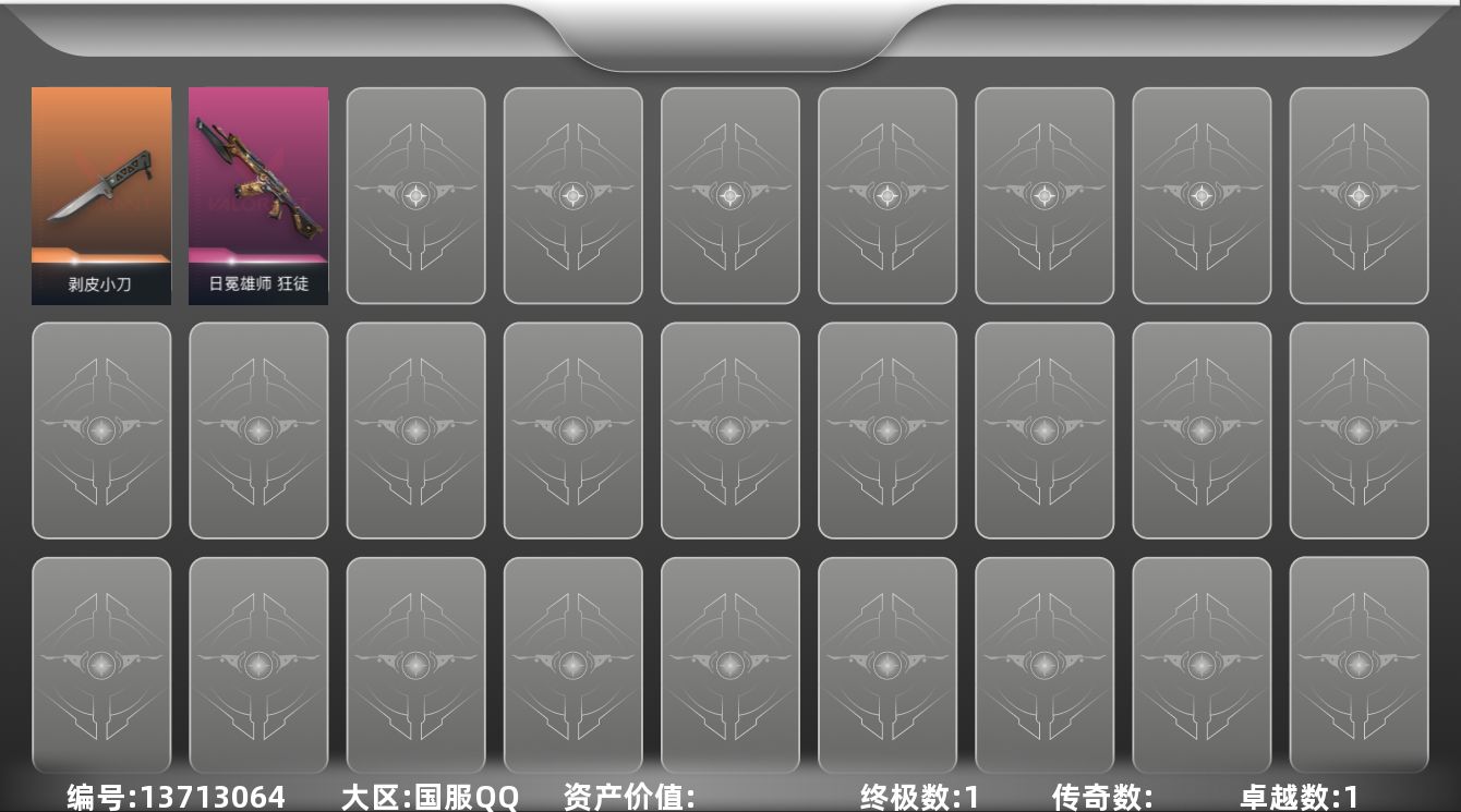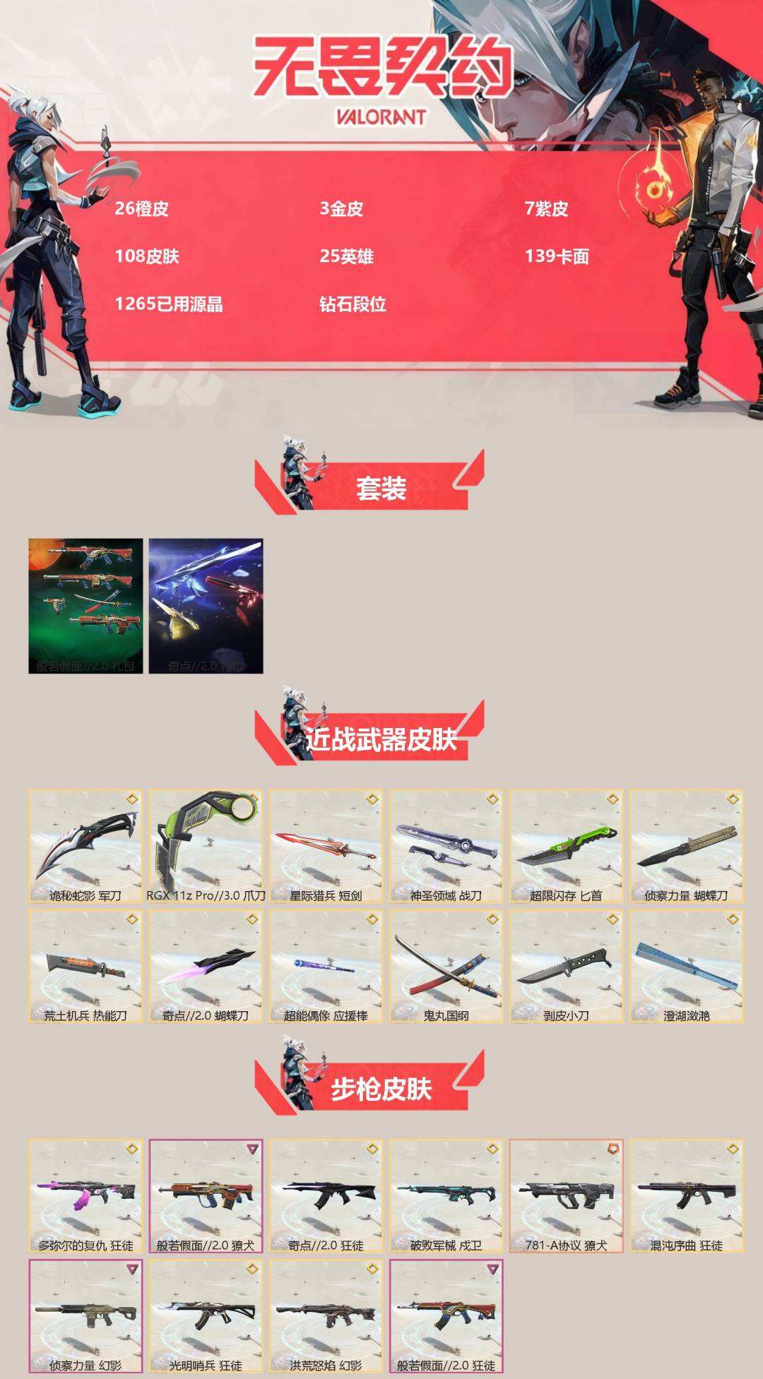 [13662249]26橙皮 3金皮 7紫皮 108皮肤 25英雄 139卡面 1265已用源晶 钻石段位 【套装】:般若假面//2.0套装,奇点//2.0套装 【近战武器皮肤】:神圣领域 战刀,诡秘蛇影,匕首-超限闪存,荒土机兵热能刀,鬼丸国纲,蝴蝶刀-奇点//2.0,星际猎兵 短剑,蝴蝶刀-侦察力量,剥皮小刀,爪刀-RGX 11z Pro 3.0,澄湖潋滟,超能偶像 应援棒 【佩枪皮肤】:鬼魅-奇点//2.0,狂怒-般若假面//2.0,正义-塑水宗,鬼魅-破败军械,标配-VCTxT1,短炮-盖亚的复仇2.0 【冲锋枪皮肤】:骇灵-塑水宗 【霰弹枪皮肤】:判官-上古龙炎,雄鹿-起源 【步枪皮肤】:獠犬-般若假面//2.0,狂徒-般若假面//2.0,狂徒-奇点//2.0,狂徒-光明哨兵,狂徒-混沌序曲,多弥尔的复仇 狂徒,幻影-侦察力量,幻影-洪荒怒焰,戍卫-破败军械,獠犬-781-A协议 【狙击枪皮肤】:莽侠-归零者//2.0,冥驹-归零者 【机枪皮肤】:战神-奇点,奥丁-艾沃莉的梦之翼,战神-般若假面//2.0 【挂饰】:超能偶像挂饰,袖珍捷风挂饰,双城之战小蛋糕挂饰,双城之战魄罗挂饰,神中神挂饰,奇点2.0挂饰,V25第三幕超凡挂饰,VCTxT1挂饰,糖葫芦挂饰,终章KO小金人挂饰无畏契约 - wegame -
