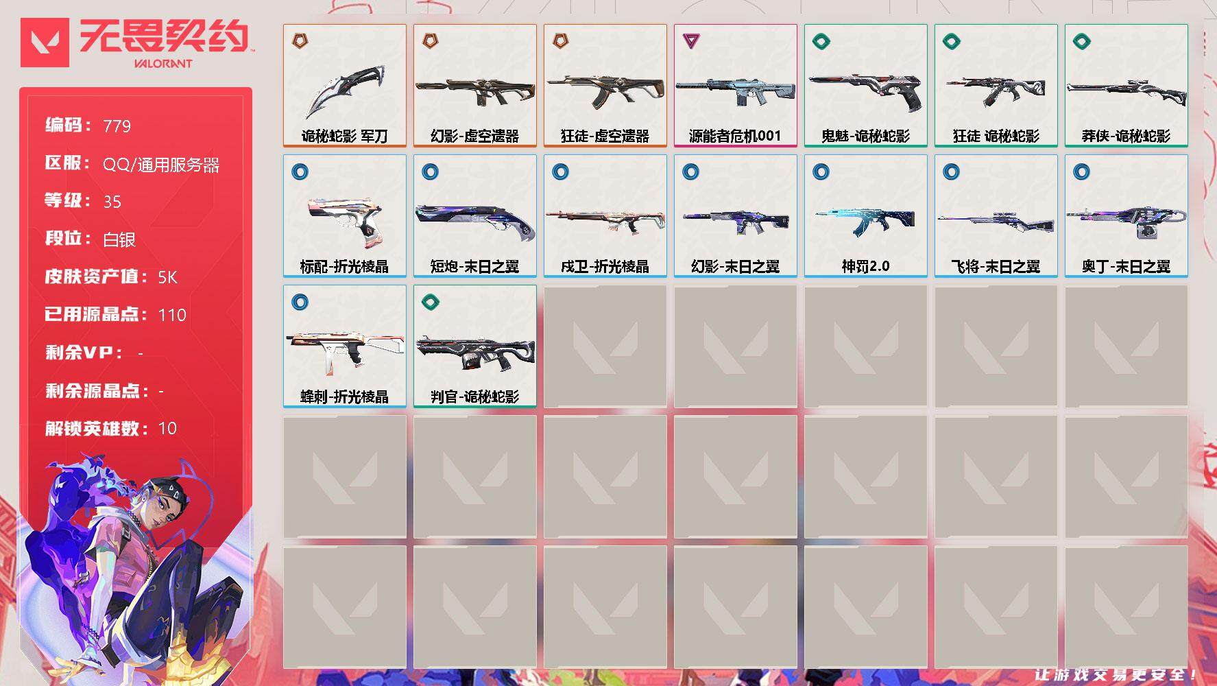 【英雄】:幻棱,炼狱,铁臂,捷风,不死鸟,贤者,猎枭,尚勃勒,霓虹,夜露【近战 武器】:近战武器-诡秘蛇影 军刀【狂徒】:狂徒-虚空遗器,狂徒-诡秘蛇影,狂徒-神罚//2.0【幻影】:幻影-虚空遗器,幻影-源能者危机001,幻影-末日之翼【戍卫】:戍卫-折光棱晶【飞将】:飞将-末日之翼【莽侠】:莽侠-诡秘蛇影【奥丁】:奥丁-末日之翼【判官】:判官-诡秘蛇影【蜂刺】:蜂刺-折光棱晶【标配】:标配-折光棱晶【鬼魅】:鬼魅-诡秘蛇影【短炮】:短炮-末日之翼【卡面】:树懒大作战 卡面,风险合作 卡面,无畏契约:尚勃勒 卡面,无垠星环 卡面,《双城之战》金克丝 卡面,代号红色 卡面,新兵报到 卡面,V契约 卡面,无畏契约 卡面【喷漆】:尚勃勒 喷漆,分身有术 喷漆,致命优雅 喷漆,放下武器 喷漆,胜利属于无畏契约 喷漆,GLHF 喷漆,无畏契约 喷漆【挂饰】:动力机箱 挂饰,有事联系 挂饰,无畏契约 纪念币 挂饰无畏契约 - wegame -