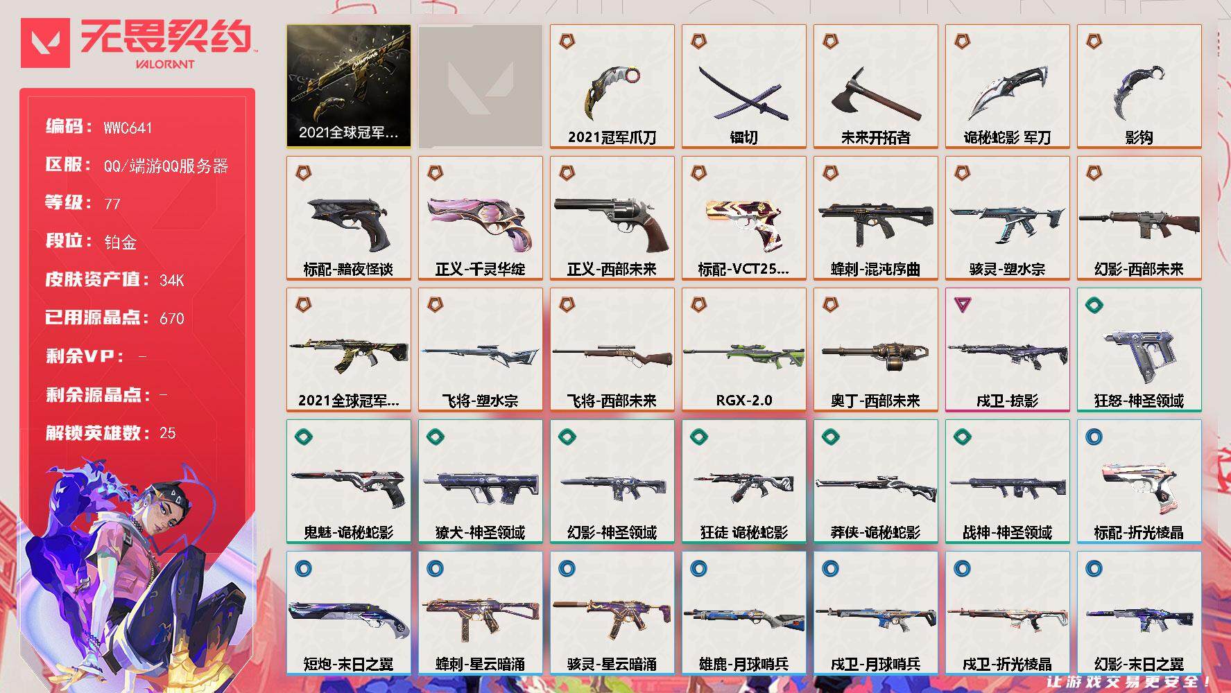 【WWC641】终极*17/卓越*1/皮肤*51/等级*77/段位:铂金/2021全球冠军赛套装/西部未来套装/幻棱/炼狱/维斯/暮蝶/钛狐/壹决/铁臂/捷风/雷兹/幽影/不死鸟/贤者/猎枭/蝰蛇/零/芮娜/奇乐/尚勃勒/霓虹/斯凯/夜露/K/O/盖可/黑梦/钢锁/近战武器-2021全球冠军赛 爪刀/近战武器-影钩/近战武器-镭切/近战武器-未来开拓者/近战武器-诡秘蛇影 军刀/狂徒-2021全球冠军赛/狂徒-诡秘蛇影/幻影-西部未来/幻影-神圣领域/幻影-末日之翼/戍卫-掠影/戍卫-月球哨兵/戍卫-折光棱晶/獠犬-神圣领域/冥驹-RGX 11z Pro//2.0/冥驹-星云暗涌/飞将-塑水无畏契约 - wegame -