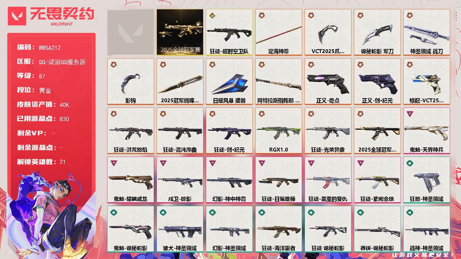 【WWSA212】终极*17/传奇*1/卓越*7/皮肤*74/等级*87/段位:黄金/2025全球冠军赛套装/VCT 2025 赛季套装/炼狱/维斯/暮蝶/铁臂/捷风/雷兹/幽影/不死鸟/贤者/猎枭/蝰蛇/零/芮娜/奇乐/尚勃勒/霓虹/斯凯/夜露/K/O/黑梦/近战武器-2025全球冠军赛 蝴蝶刀/近战武器-影钩/近战武器-VCT 2025 爪刀/近战武器-定海神珍/近战武器-诡秘蛇影 军刀/近战武器-神圣领域 战刀/近战武器-日耀风暴 遗器/近战武器-阿特拉斯指挥部 甩棍/狂徒-超时空卫队/狂徒-2025全球冠军赛/狂徒-洪荒怒焰/狂徒-混沌序曲/狂徒-创·纪元/狂徒-RGX 11z Pr无畏契约 - wegame -