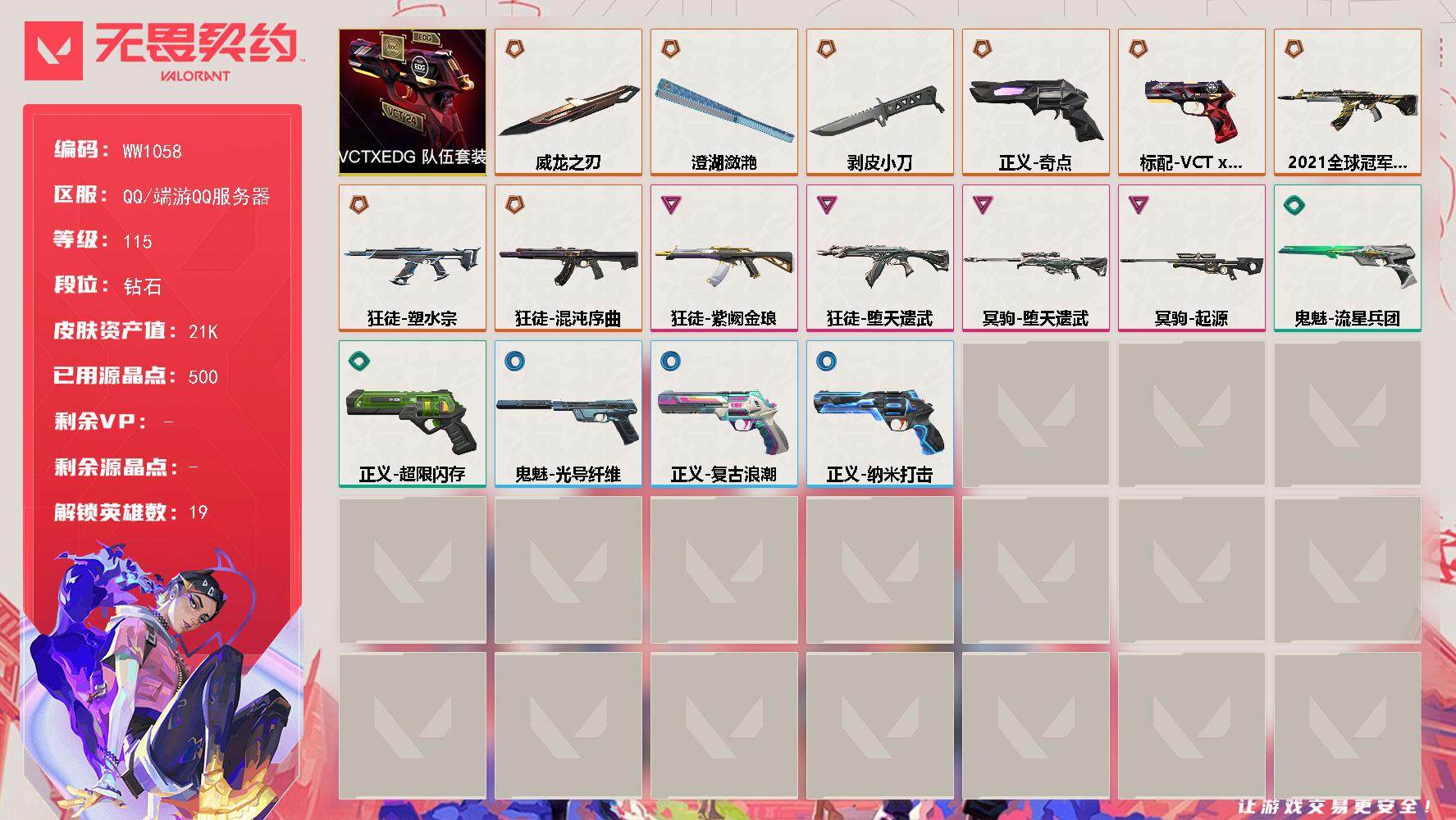 【WW1058】终极*8/卓越*4/皮肤*17/等级*115/段位:钻石/VCTxEDG 队伍套装/炼狱/维斯/暮蝶/钛狐/壹决/捷风/雷兹/幽影/不死鸟/贤者/猎枭/零/芮娜/尚勃勒/霓虹/夜露/K/O/盖可/近战武器-剥皮小刀/近战武器-威龙之刃/近战武器-澄湖潋滟/狂徒-2021全球冠军赛/狂徒-混沌序曲/狂徒-塑水宗/狂徒-堕天遗武/狂徒-紫阙金琅/冥驹-堕天遗武/冥驹-起源/标配-VCT x EDG/正义-奇点/正义-超限闪存/正义-复古浪潮/正义-纳米打击/鬼魅-流星兵团/鬼魅-光导纤维/进入射程 卡面/《双城之战》拥抱 卡面/精灵大战 卡面/欢迎来到底城 卡面/南瓜盛典 卡面/无畏契约 - wegame -