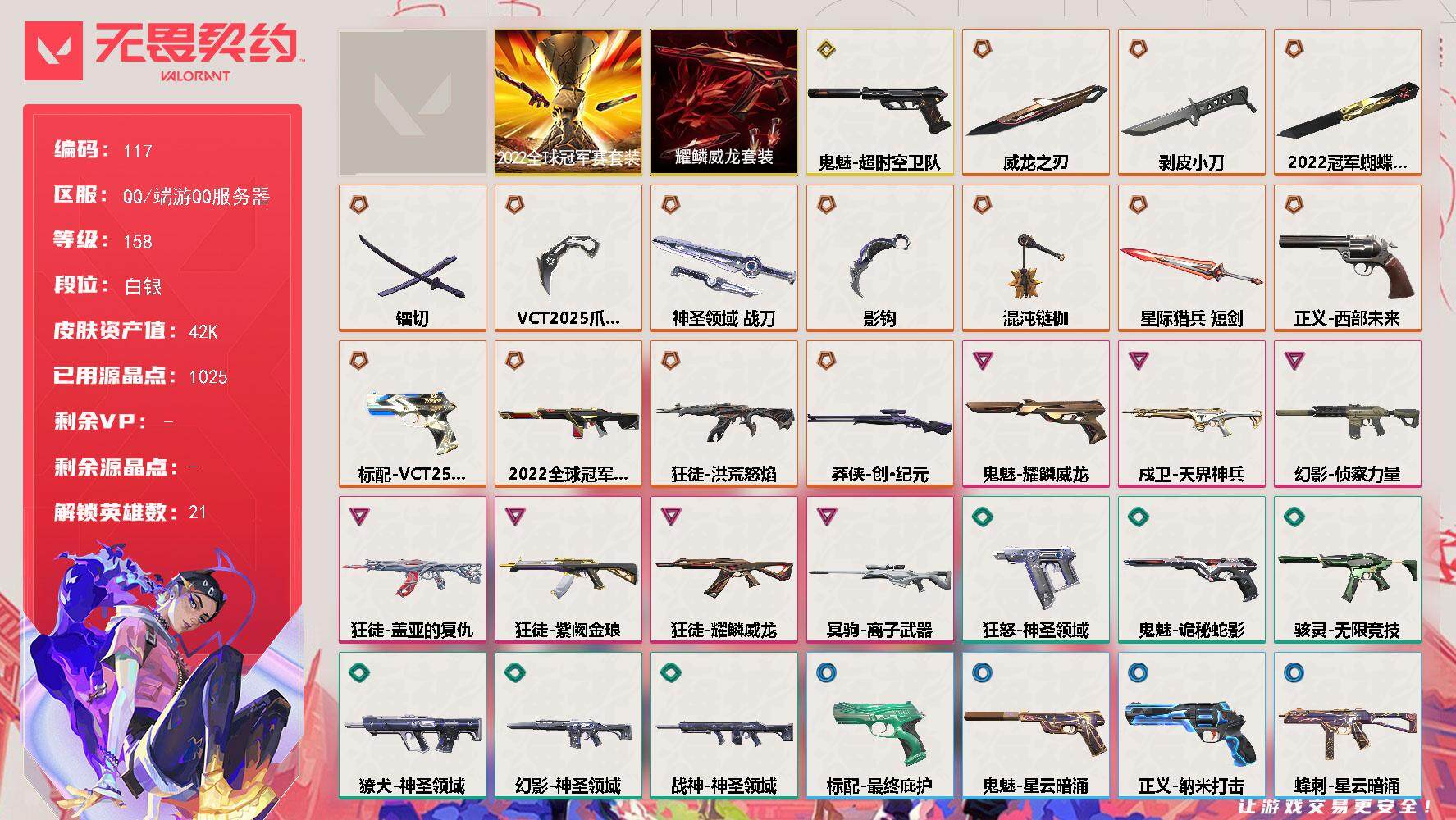 [13698628]【套装】:2022全球冠军赛套装,VCT 2025 赛季套装,耀鳞威龙套装【英雄】:幻棱,炼狱,维斯,暮蝶,钛狐,壹决,捷风,幽影,不死鸟,贤者,猎枭,零,芮娜,尚勃勒,霓虹,斯凯,夜露,K/O,盖可,钢锁【近战 武器】:近战武器-2022全球冠军赛 蝴蝶刀,近战武器-混沌链枷,近战武器-影钩,近战武器-剥皮小刀,近战武器-VCT 2025 爪刀,近战武器-镭切,近战武器-威龙之刃,近战武器-神圣领域 战刀,近战武器-星际猎兵 短剑【狂徒】:狂徒-洪荒怒焰,狂徒-盖亚的复仇,狂徒-耀鳞威龙,狂徒-紫阙金琅【幻影】:幻影-2022全球冠军赛,幻影-侦察力量,幻影-神圣领域【戍卫】:戍卫-天界神兵,戍卫-月球哨兵【獠犬】:獠犬-神圣领域【冥驹】:冥驹-离子武器,冥驹-星云暗涌【莽侠】:莽侠-创·纪元,莽侠-月球哨兵【战神】:战神-神圣领域【雄鹿】:雄鹿-月球哨兵【骇灵】:骇灵-无限竞技,骇灵-星云暗涌【蜂刺】:蜂刺-星云暗涌【标配】:标配-最终庇护【VCT手枪】:标配-VCT25 x 100T【正义】:正义-西部未来,正义-纳米打击,正义-月球哨兵【鬼魅】:鬼魅-超时空卫队,鬼魅-耀鳞威龙,鬼魅-诡秘蛇影,鬼魅-星云暗涌【狂怒】:狂怒-神圣领域【卡面】:终章:激斗汉堡 卡面,进入射程 卡面,《双城之战》拥抱 卡面,精灵大战 卡面,欢迎来到底城 卡面,南瓜盛典 卡面,热舞环节 卡面,正义的化身 卡面,复活专家 卡面,树懒大作战 卡面,红鳞松叶 卡面,Clutch 卡面,无畏契约GO!第一卷:芮娜 卡面,复古浪潮 卡面,无畏契约GO!第一卷:零 卡面,《双城之战》金克丝 卡面,暗枪 卡面,无畏契约GO!第一卷:贤者 卡面,代号红色 卡面,新兵报到 卡面,V契约 卡面,无畏契约 卡面【喷漆】:嗨宝南瓜灯 喷漆,嘭! 喷漆,都算到了 喷漆,控场勿近 喷漆,霓光四射 喷漆,买装还是存钱 喷漆,关门放狗 喷漆,无畏契约GO!第一卷:芮娜 喷漆,无畏契约GO!第一卷:零 喷漆,胜利属于无畏契约 喷漆,GLHF 喷漆,无畏契约 喷漆【挂饰】:终章:猫猫木乃伊 挂饰,悠闲鸡块 挂饰,伞绳 挂饰,《双城之战》小蛋糕 挂饰,第九季//第三幕 纪念币 挂饰,无畏契约GO!第一卷 芮娜 挂饰,无畏契约GO!第一卷 零 挂饰,鱼骨头 挂饰,第九季//第二幕