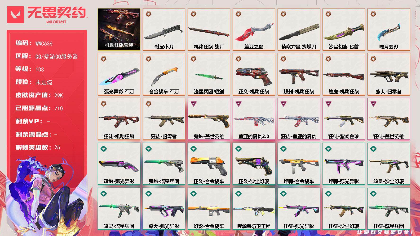 【WWD96】终极*7/卓越*3/皮肤*33/等级*66/段位:未定级/炼狱/暮蝶/壹决/捷风/不死鸟/贤者/猎枭/零/芮娜/尚勃勒/霓虹/夜露/K/O/盖可/黑梦/近战武器-神之刃/近战武器-RGX 11z Pro//2.0 蝴蝶刀/近战武器-日耀风暴 遗器/狂徒-2025全球冠军赛/狂徒-塑水宗/狂徒-盖亚的复仇/幻影-神中神罚/戍卫-电音光谱/冥驹-堕天遗武/正义-千灵华绽/树懒大作战 卡面/无畏契约GO!第一卷:芮娜 卡面/无畏契约GO!第一卷:零 卡面/代号红色 卡面/新兵报到 卡面/V契约 卡面/无畏契约 卡面/买装还是存钱 喷漆/胜利属于无畏契约 喷漆/GLHF 喷漆/无畏契约