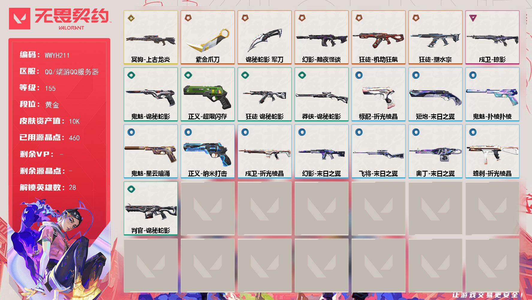 【WWYH211】终极*5/传奇*1/卓越*1/皮肤*25/等级*155/段位:黄金/幻棱/炼狱/维斯/暮蝶/钛狐/壹决/铁臂/捷风/雷兹/幽影/不死鸟/贤者/猎枭/蝰蛇/零/芮娜/奇乐/尚勃勒/霓虹/斯凯/夜露/星礈/K/O/海神/盖可/黑梦/钢锁/近战武器-紫金爪刀/近战武器-诡秘蛇影 军刀/狂徒-机动狂飙/狂徒-塑水宗/狂徒-诡秘蛇影/幻影-黯夜怪谈/幻影-末日之翼/戍卫-掠影/戍卫-折光棱晶/冥驹-上古龙炎/飞将-末日之翼/莽侠-诡秘蛇影/奥丁-末日之翼/判官-诡秘蛇影/蜂刺-折光棱晶/标配-折光棱晶/正义-超限闪存/正义-纳米打击/鬼魅-诡秘蛇影/鬼魅-扑棱扑棱/鬼魅-星云暗涌/短无畏契约 - wegame -