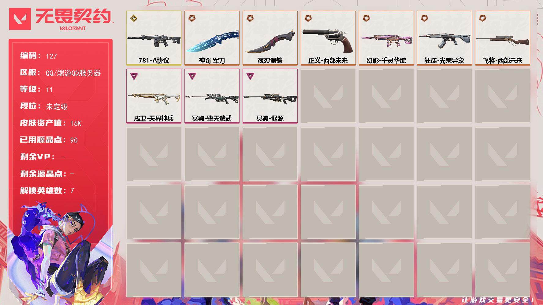 [13701513]【英雄】:炼狱,壹决,捷风,不死鸟,贤者,猎枭,芮娜【近战 武器】:近战武器-神罚 军刀,近战武器-夜刃诡镰【狂徒】:狂徒-光荣异象【幻影】:幻影-781-A协议,幻影-千灵华绽【戍卫】:戍卫-天界神兵【冥驹】:冥驹-堕天遗武,冥驹-起源【飞将】:飞将-西部未来【正义】:正义-西部未来【卡面】:代号红色 卡面,新兵报到 卡面,V契约 卡面,无畏契约 卡面【喷漆】:胜利属于无畏契约 喷漆,GLHF 喷漆,无畏契约 喷漆【挂饰】:《双城之战》魄罗 挂饰,无畏契约 纪念币 挂饰无畏契约 - wegame -
