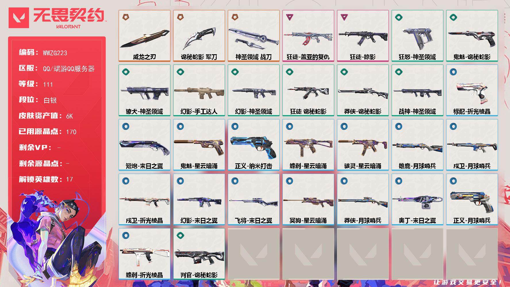 【WWZG223】终极*3/卓越*2/皮肤*33/等级*111/段位:白银/幻棱/炼狱/暮蝶/钛狐/壹决/铁臂/捷风/雷兹/幽影/不死鸟/贤者/猎枭/零/芮娜/霓虹/夜露/盖可/近战武器-威龙之刃/近战武器-诡秘蛇影 军刀/近战武器-神圣领域 战刀/狂徒-掠影/狂徒-盖亚的复仇/狂徒-诡秘蛇影/幻影-手工达人/幻影-神圣领域/幻影-末日之翼/戍卫-月球哨兵/戍卫-折光棱晶/獠犬-神圣领域/冥驹-星云暗涌/飞将-末日之翼/莽侠-诡秘蛇影/莽侠-月球哨兵/战神-神圣领域/奥丁-末日之翼/判官-诡秘蛇影/雄鹿-月球哨兵/骇灵-星云暗涌/蜂刺-星云暗涌/蜂刺-折光棱晶/标配-折光棱晶/正义-纳米打击