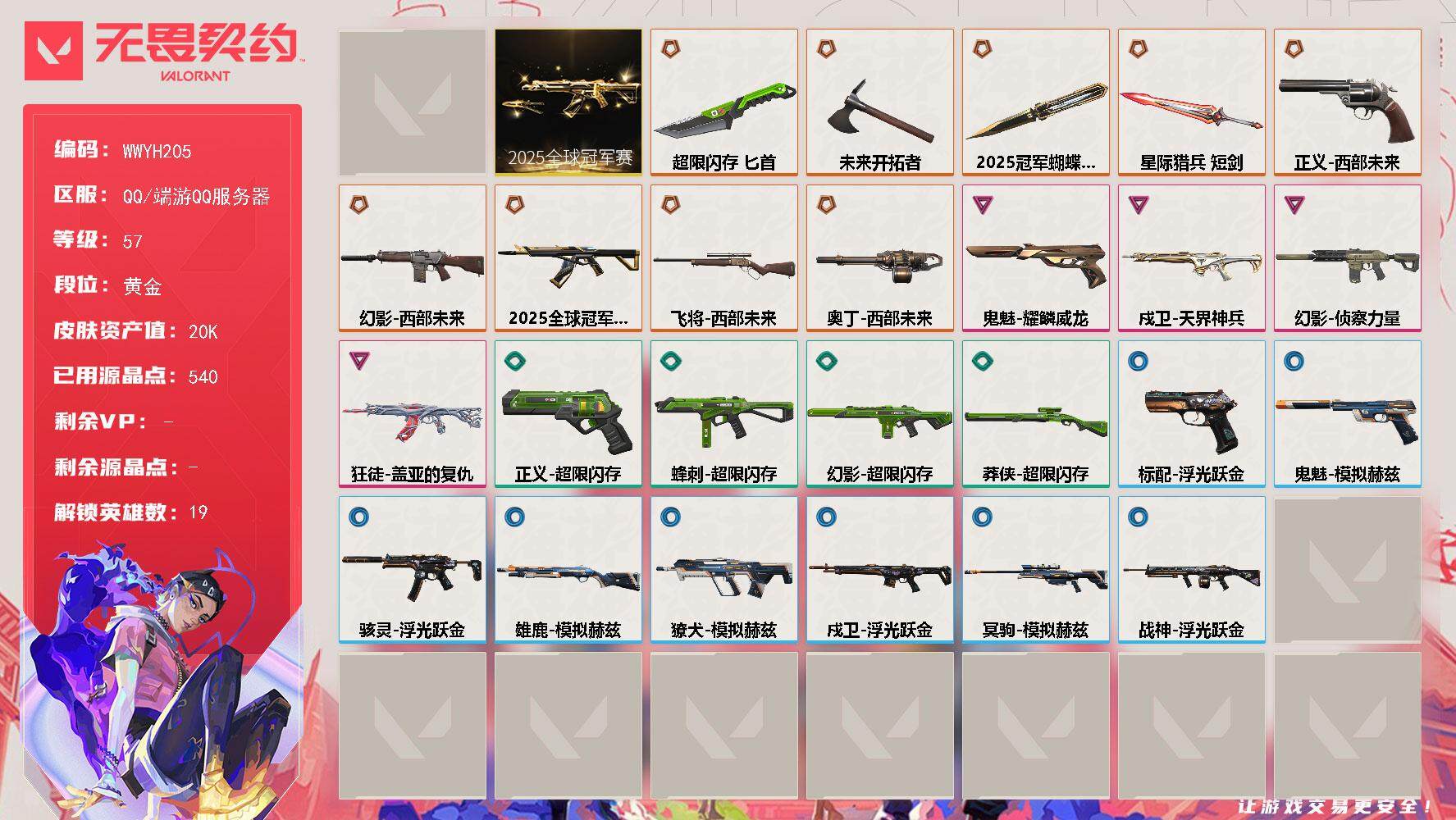 【WWYH205】终极*9/卓越*4/皮肤*37/等级*57/段位:黄金/2025全球冠军赛套装/西部未来套装/幻棱/炼狱/维斯/暮蝶/钛狐/壹决/铁臂/捷风/雷兹/幽影/不死鸟/贤者/猎枭/零/芮娜/K/O/黑梦/钢锁/近战武器-2025全球冠军赛 蝴蝶刀/近战武器-未来开拓者/近战武器-超限闪存 匕首/近战武器-星际猎兵 短剑/狂徒-2025全球冠军赛/狂徒-盖亚的复仇/幻影-西部未来/幻影-侦察力量/幻影-超限闪存/戍卫-天界神兵/戍卫-浮光跃金/獠犬-模拟赫兹/冥驹-模拟赫兹/飞将-西部未来/莽侠-超限闪存/战神-浮光跃金/奥丁-西部未来/雄鹿-模拟赫兹/骇灵-浮光跃金/蜂刺-超限闪无畏契约 - wegame -