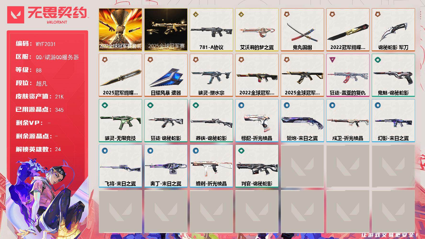 【WYF2031】终极*8/传奇*2/卓越*1/皮肤*37/等级*88/段位:超凡/2025全球冠军赛套装/2022全球冠军赛套装/幻棱/炼狱/维斯/暮蝶/壹决/铁臂/捷风/幽影/不死鸟/贤者/猎枭/蝰蛇/零/芮娜/奇乐/尚勃勒/霓虹/夜露/星礈/K/O/盖可/黑梦/钢锁/近战武器-2025全球冠军赛 蝴蝶刀/近战武器-2022全球冠军赛 蝴蝶刀/近战武器-鬼丸国纲/近战武器-诡秘蛇影 军刀/近战武器-日耀风暴 遗器/狂徒-2025全球冠军赛/狂徒-盖亚的复仇/狂徒-诡秘蛇影/幻影-781-A协议/幻影-2022全球冠军赛/幻影-末日之翼/戍卫-折光棱晶/飞将-末日之翼/莽侠-诡秘蛇影/奥丁无畏契约 - wegame -