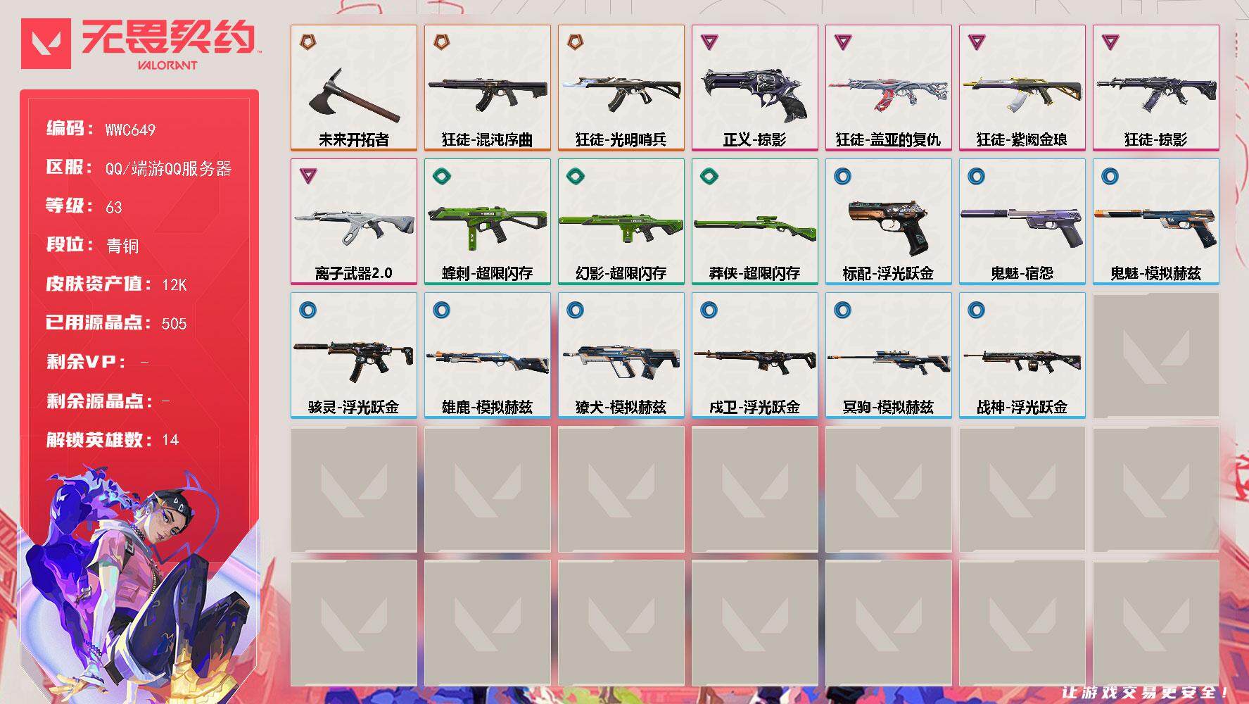 【WWC649】终极*3/卓越*5/皮肤*22/等级*63/段位:青铜/幻棱/炼狱/维斯/钛狐/壹决/捷风/不死鸟/贤者/猎枭/零/芮娜/尚勃勒/夜露/近战武器-未来开拓者/狂徒-光明哨兵/狂徒-混沌序曲/狂徒-掠影/狂徒-盖亚的复仇/狂徒-紫阙金琅/狂徒-离子武器//2.0/幻影-超限闪存/戍卫-浮光跃金/獠犬-模拟赫兹/冥驹-模拟赫兹/莽侠-超限闪存/战神-浮光跃金/雄鹿-模拟赫兹/骇灵-浮光跃金/蜂刺-超限闪存/标配-浮光跃金/正义-掠影/鬼魅-模拟赫兹/鬼魅-宿怨/《双城之战》拥抱 卡面/精灵大战 卡面/欢迎来到底城 卡面/南瓜盛典 卡面/VCT CN首冠 卡面/唱片的故事 卡面/钢无畏契约 - wegame -