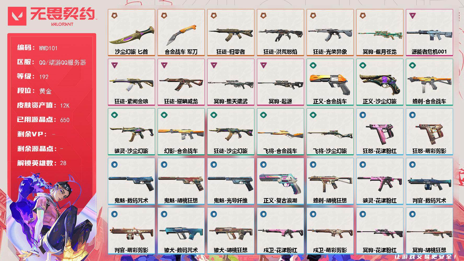 【WWD101】终极*6/卓越*5/皮肤*41/等级*192/段位:黄金/幻棱/炼狱/维斯/暮蝶/钛狐/壹决/铁臂/捷风/雷兹/幽影/不死鸟/贤者/猎枭/蝰蛇/零/芮娜/奇乐/尚勃勒/霓虹/斯凯/夜露/星礈/K/O/海神/盖可/黑梦/钢锁/近战武器-合金战车 军刀/近战武器-沙尘幻旅 匕首/狂徒-归零者/狂徒-洪荒怒焰/狂徒-光荣异象/狂徒-耀鳞威龙/狂徒-紫阙金琅/狂徒-沙尘幻旅/幻影-源能者危机001/幻影-合金战车/戍卫-花漾粉红/戍卫-萌彩剪影/獠犬-胡桃狂想/獠犬-数码咒术/冥驹-偃月苍龙/冥驹-堕天遗武/冥驹-起源/冥驹-胡桃狂想/冥驹-花漾粉红/飞将-合金战车/飞将-沙尘幻旅/无畏契约 - wegame -