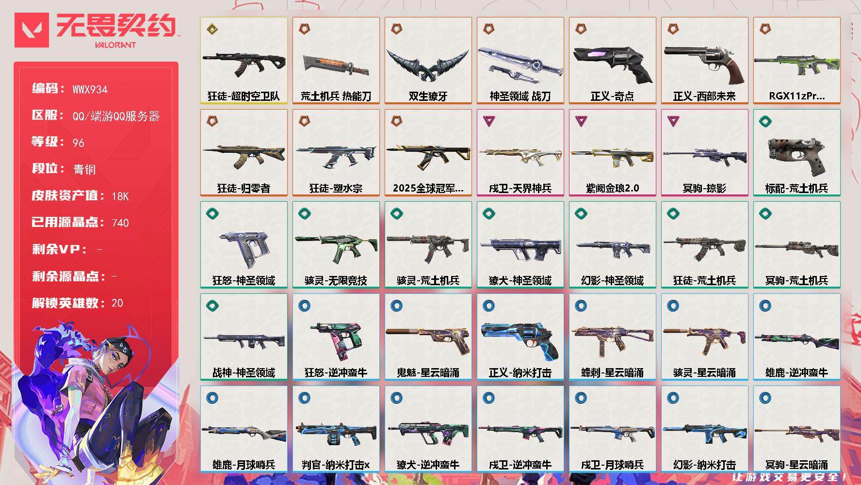 【WWX934】终极*9/传奇*1/卓越*3/皮肤*40/等级*96/段位:青铜/幻棱/炼狱/维斯/暮蝶/钛狐/壹决/捷风/幽影/不死鸟/贤者/猎枭/零/芮娜/尚勃勒/霓虹/夜露/K/O/黑梦/钢锁/近战武器-双生獠牙/近战武器-荒土机兵 热能刀/近战武器-神圣领域 战刀/狂徒-超时空卫队/狂徒-2025全球冠军赛/狂徒-归零者/狂徒-塑水宗/狂徒-荒土机兵/幻影-RGX 11z Pro//2.0/幻影-紫阙金琅//2.0/幻影-神圣领域/幻影-纳米打击/戍卫-天界神兵/戍卫-逆冲蛮牛/戍卫-月球哨兵/獠犬-神圣领域/獠犬-逆冲蛮牛/冥驹-掠影/冥驹-荒土机兵/冥驹-星云暗涌/莽侠-月球哨兵无畏契约 - wegame -