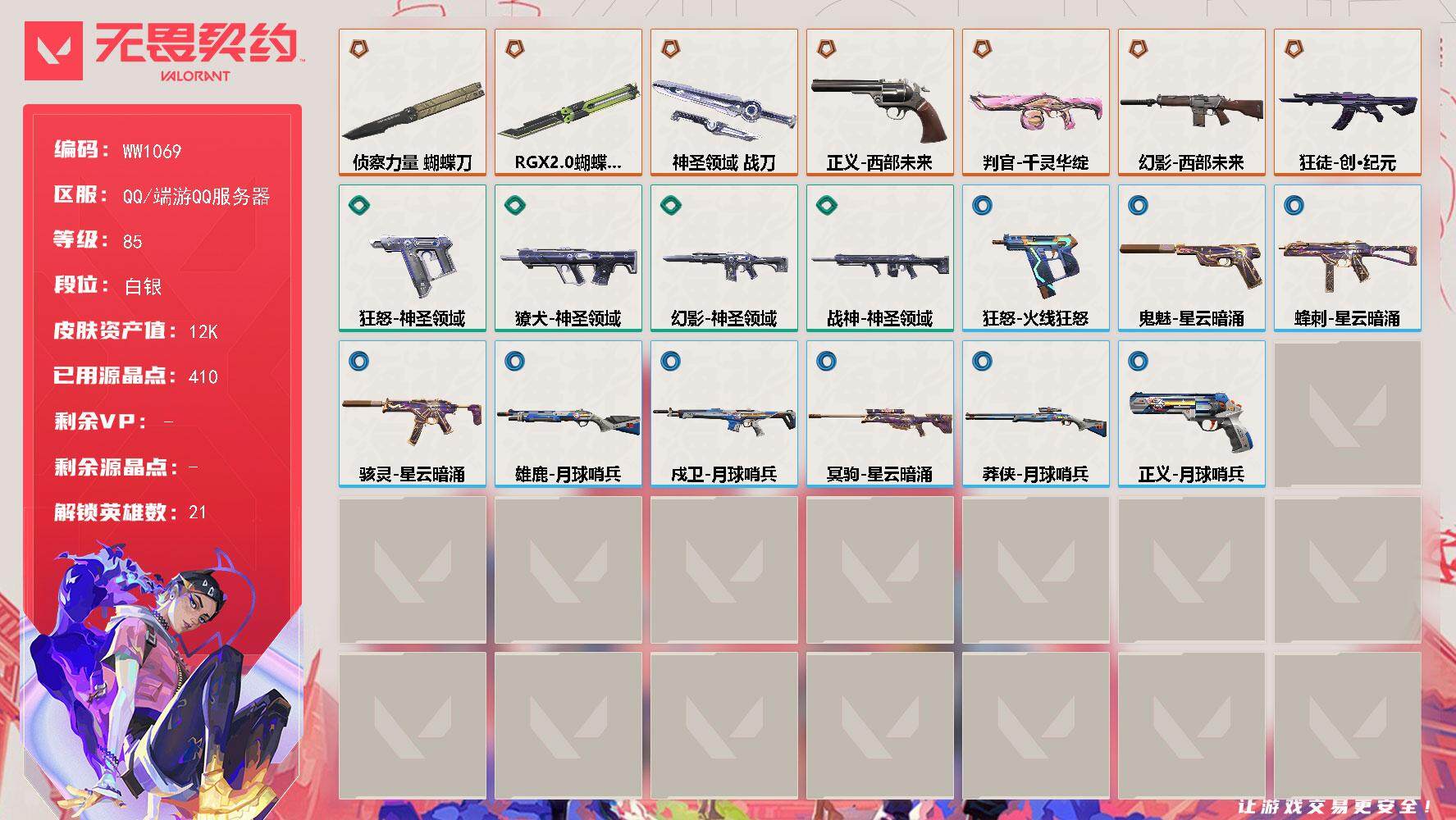 【WW1069】终极*7/皮肤*23/等级*85/段位:白银/幻棱/炼狱/维斯/暮蝶/钛狐/壹决/捷风/雷兹/幽影/不死鸟/贤者/猎枭/零/芮娜/尚勃勒/霓虹/夜露/K/O/盖可/黑梦/近战武器-RGX 11z Pro//2.0 蝴蝶刀/近战武器-侦察力量 蝴蝶刀/近战武器-神圣领域 战刀/狂徒-创·纪元/幻影-西部未来/幻影-神圣领域/戍卫-月球哨兵/獠犬-神圣领域/冥驹-星云暗涌/莽侠-月球哨兵/战神-神圣领域/判官-千灵华绽/雄鹿-月球哨兵/骇灵-星云暗涌/蜂刺-星云暗涌/正义-西部未来/正义-月球哨兵/鬼魅-星云暗涌/狂怒-神圣领域/狂怒-火线狂怒/梦幻奶茶 卡面/零点嗅探设计图 卡无畏契约 - wegame -