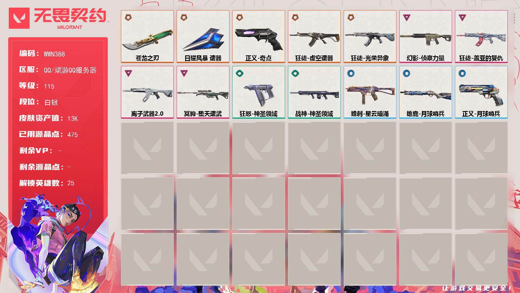 【WWN388】终极*5/卓越*4/皮肤*29/等级*115/段位:白银/幻棱/炼狱/维斯/暮蝶/钛狐/壹决/铁臂/捷风/雷兹/幽影/不死鸟/贤者/猎枭/蝰蛇/零/芮娜/奇乐/尚勃勒/霓虹/夜露/K/O/盖可/黑梦/钢锁/近战武器-5周年//公测重制版 苍龙之刃/近战武器-日耀风暴 遗器/狂徒-虚空遗器/狂徒-光荣异象/狂徒-盖亚的复仇/狂徒-离子武器//2.0/幻影-侦察力量/冥驹-堕天遗武/战神-神圣领域/雄鹿-月球哨兵/蜂刺-星云暗涌/正义-奇点/正义-月球哨兵/狂怒-神圣领域/树懒大作战 卡面/无畏契约GO!第一卷:零 卡面/无垠星环 卡面/《双城之战》金克丝 卡面/暗枪 卡面/代号无畏契约 - wegame -