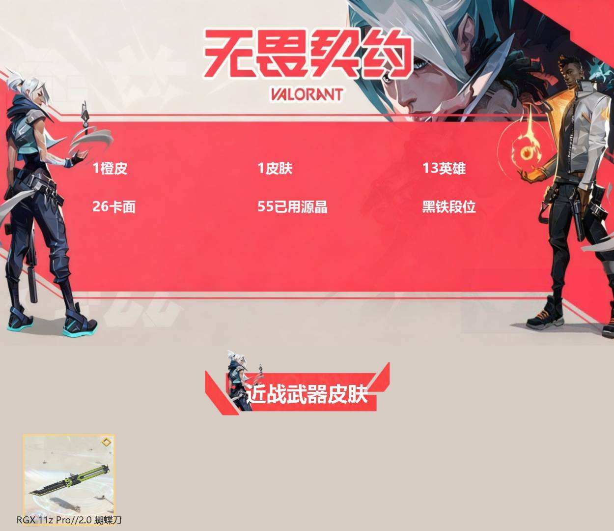 [13695979]1橙皮 1皮肤 13英雄 26卡面 55已用源晶 黑铁段位 【近战武器皮肤】:RGX 11z Pro//2.0 蝴蝶刀无畏契约 - wegame -