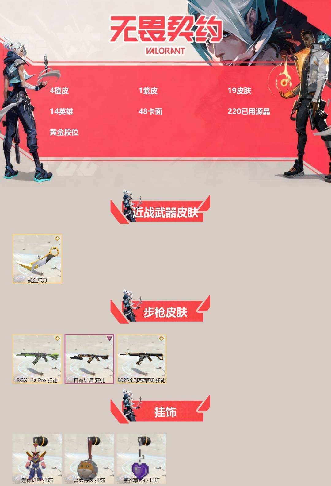[13706309]4橙皮 1紫皮 19皮肤 14英雄 48卡面 220已用源晶 黄金段位 【近战武器皮肤】:紫金爪刀【步枪皮肤】:2025全球冠军赛 狂徒,狂徒-RGX 11z pro,狂徒-日冕雄师【挂饰】:薰衣草之心挂饰,蓄势待滚挂饰,迷你机甲挂饰