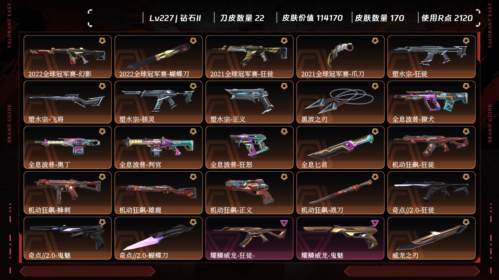 [13719254]R33515 Lv227 ,皮肤总价值114170,钻石II,总皮肤170,刀皮22枪皮148(终极2传奇28卓越15),套装8(传奇6卓越2),2021全球冠军赛套装,塑水宗套装,奇点2.0套装,耀鳞威龙套装,具体详情看图无畏契约 - wegame -