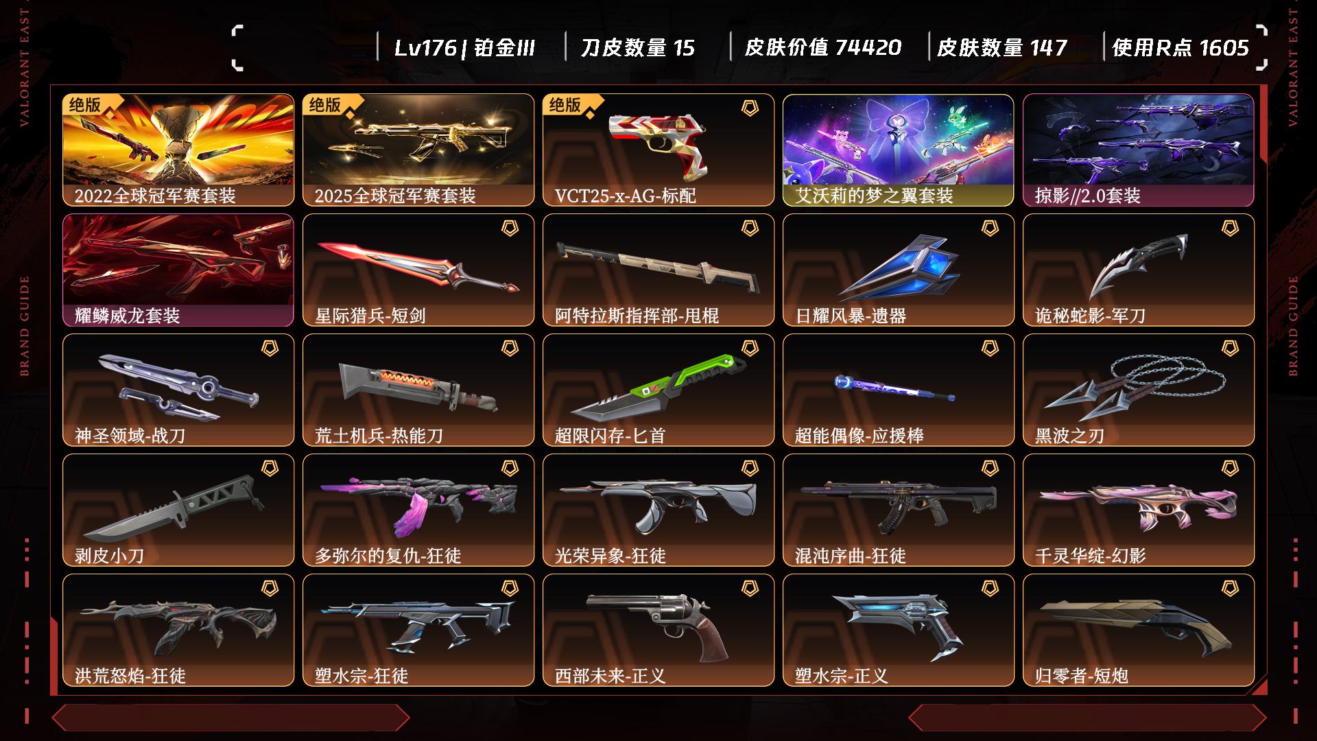 [13720986]R34155 Lv176 ,皮肤总价值74420,铂金III,总皮肤147,刀皮15枪皮132(终极4传奇13卓越17),套装5(终极1传奇2卓越2),艾沃莉的梦之翼套装,耀鳞威龙套装,具体详情看图无畏契约 - wegame -