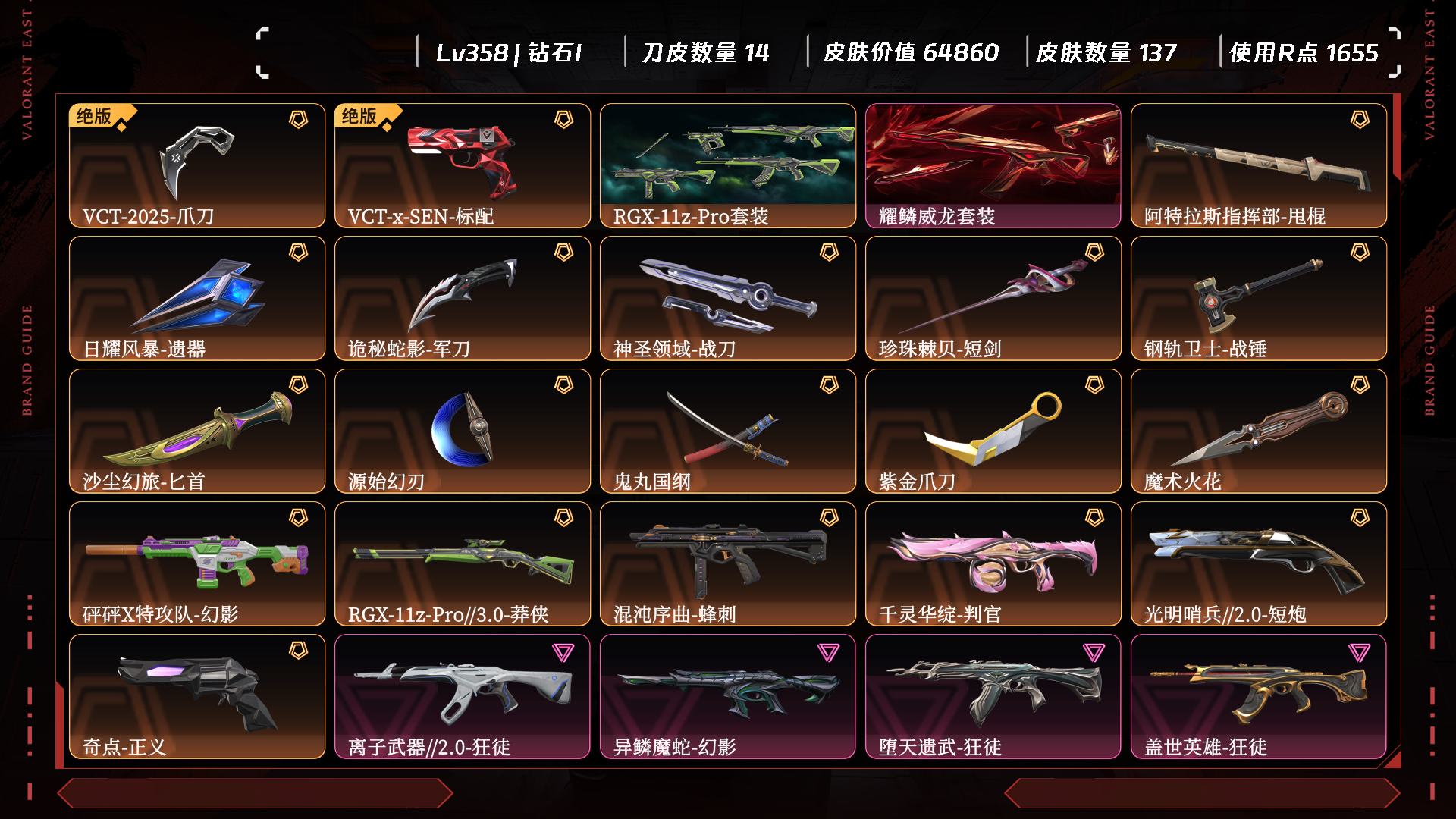 [13759389]R34189 无二次 剩余点券:92 Lv358 ,皮肤总价值64860,钻石I,总皮肤137,刀皮14枪皮123(传奇11卓越19),套装2(传奇1卓越1),耀鳞威龙套装,具体详情看图无畏契约 - wegame -