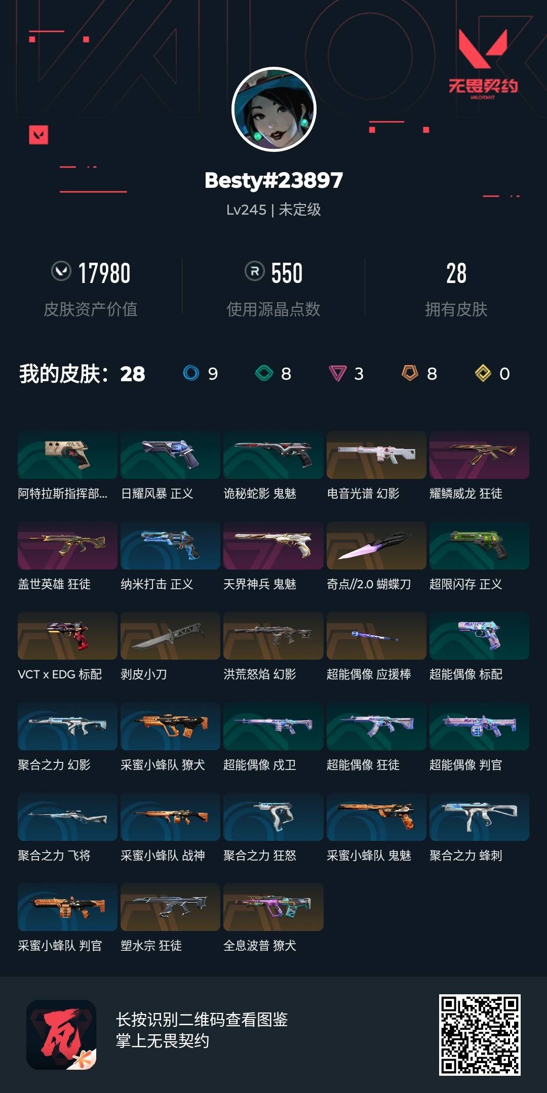 [13860562]B189277 无畏契约/245等级/未定级/27英雄/28皮肤/17980资产/已使用R点550/剩余R点240/超能偶像-应援棒,奇点//2.0-蝴蝶刀,剥皮小刀,电音光谱-幻影,洪荒怒焰-幻影,塑水宗-狂徒,全息波普-獠犬,盖世英雄-狂徒,耀鳞威龙-狂徒-,VCT-x-EDG-标配,天界神兵-鬼魅无畏契约 - wegame -