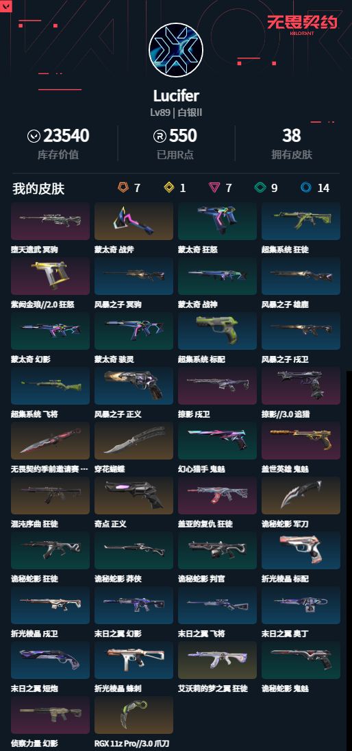 HK654/【账号状态】无封号/【区服】QQ/【游戏等级】Lv89/【游戏段位】白银II/【剩余V点】829/【剩余R点】0/【皮肤资产价值】23540/【使用R点】550/【英雄数量】25/【皮肤数量】38/【卡面数量】55/【喷漆数量】46/【挂件数量】40/【拥有套装】/【拥有近战武器】蒙太奇-战斧/无畏契约季前邀请赛-悲悯之刃/诡秘蛇影-军刀/RGX-11z-Pro//3.0-爪刀/穿花蝴蝶//【拥有步枪】混沌序曲-狂徒/艾沃莉的梦之翼-狂徒/盖亚的复仇-狂徒/侦察力量-幻影/掠影-戍卫/蒙太奇-幻影/诡秘蛇影-狂徒/超集系统-狂徒/风暴之子-戍卫/折光棱晶-戍卫/末日之翼-幻影//【拥有狙击枪】堕天遗武-冥驹/诡秘蛇影-莽侠/风暴之子-冥驹/超集系统-飞将/末日之翼-飞将//【拥有机枪】蒙太奇-战神/末日之翼-奥丁//【拥有冲锋枪】蒙太奇-骇灵/折光棱晶-蜂刺//【拥有霰弹枪】诡秘蛇影-判官/风暴之子-雄鹿//【拥有手枪】奇点-正义/掠影//3.0-追猎/紫阙金琅//2.0-狂怒/盖世英雄-鬼魅/蒙太奇-狂怒/幻心猎手-鬼魅/诡秘蛇影-鬼魅/超集系统-标配/风暴之子-正义/折光棱晶-标配/末日之翼-短炮//【稀有挂件】V25第六幕青铜挂饰/V25第三幕黑铁挂饰/好运福爪挂饰//【卡面信息】逆向独行卡面/找回包赔无畏契约 - wegame -