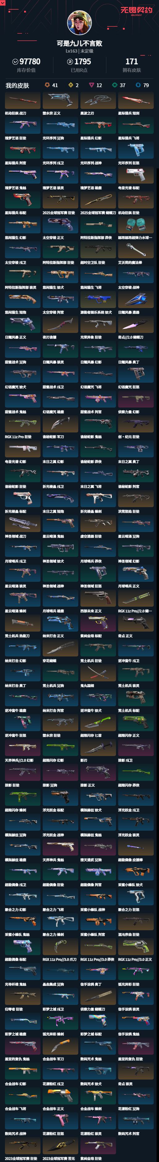 [13382190]R32923 Lv264 ,皮肤总价值87810,未定级,总皮肤188,刀皮16枪皮172(终极6传奇18卓越24),套装2(传奇1卓越1),具体详情看图无畏契约 - wegame -
