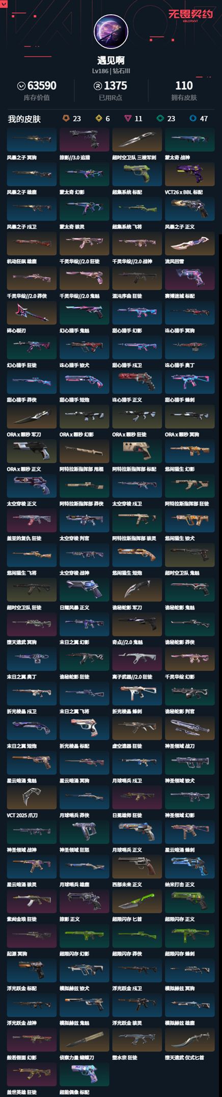 HK656/【账号状态】无封号/【区服】QQ/【游戏等级】Lv186/【游戏段位】钻石III/【剩余V点】/【剩余R点】/【皮肤资产价值】63590/【使用R点】1375/【英雄数量】28/【皮肤数量】110/【卡面数量】139/【喷漆数量】128/【挂件数量】105/【拥有套装】ORA-x-颗秒套装(ORA-x-颗秒-狂徒/ORA-x-颗秒-幻影/ORA-x-颗秒-冥驹/ORA-x-颗秒-正义/ORA-x-颗秒-军刀)千灵华绽//2.0套装(千灵华绽//2.0-狂徒/千灵华绽//2.0-战神/千灵华绽//2.0-莽侠/千灵华绽//2.0-鬼魅/流风回雪)/【拥有近战武器】碎心裂刃/阿特拉斯指挥部-甩棍/诡秘蛇影-军刀/神圣领域-战刀/VCT-2025-爪刀/超限闪存-匕首/超时空卫队-三棱军刺/堕天遗武-仪式匕首/侦察力量-蝴蝶刀//【拥有步枪】虚空遗器-狂徒/混沌序曲-狂徒/千灵华绽-幻影/塑水宗-狂徒/超时空卫队-狂徒/离子武器//2.0-狂徒/盖世英雄-狂徒/紫阙金琅-狂徒/盖亚的复仇-狂徒/般若假面-幻影/日冕雄师-狂徒/蒙太奇-幻影/幻心猎手-狂徒/阿特拉斯指挥部-狂徒/诡秘蛇影-狂徒/神圣领域-獠犬/神圣领域-幻影/超限闪存-幻影/风暴之子-戍卫/甜心猎手-幻影/诛心猎手-獠犬/甜心猎手-戍卫/悠闲猫生-幻影/太空穿梭-戍卫/悠闲猫生-獠犬/末日之翼-幻影/折光棱晶-戍卫/月球哨兵-戍卫/模拟赫兹-獠犬/浮光跃金-戍卫//【拥有狙击枪】堕天遗武-冥驹/起源-冥驹/阿特拉斯指挥部-莽侠/诡秘蛇影-莽侠/超限闪存-莽侠/风暴之子-冥驹/超集系统-飞将/诛心猎手-冥驹/甜心猎手-莽侠/悠闲猫生-飞将/末日之翼-飞将/星云暗涌-冥驹/月球哨兵-莽侠/模拟赫兹-冥驹//【拥有机枪】蒙太奇-战神/神圣领域-战神/诛心猎手-奥丁/太空穿梭-战神/末日之翼-奥丁/浮光跃金-战神//【拥有冲锋枪】蒙太奇-骇灵/阿特拉斯指挥部-骇灵/超限闪存-蜂刺/甜心猎手-蜂刺/折光棱晶-蜂刺/星云暗涌-蜂刺/星云暗涌-骇灵/浮光跃金-骇灵//【拥有霰弹枪】机动狂飙-雄鹿/诡秘蛇影-判官/风暴之子-雄鹿/太空穿梭-判官/月球哨兵-雄鹿/模拟赫兹-雄鹿//【拥有手枪】VCT26-x-BBL-标配/西部未来-正义/奇点/2.0-鬼魅/超时空卫队-鬼魅/掠影//3.0-追猎/赛博迷城-标配/掠影-正义/幻心猎手-鬼魅/阿特拉斯指挥部-标配/日耀风暴-正义/诡秘蛇影-鬼魅/神圣领域-狂怒/超限闪存-正义/超能偶像-标配/超集系统-标配/风暴之子-正义/甜心猎手-短炮/诛心猎手-正义/太空穿梭-正义/悠闲猫生-短炮/末日之翼-短炮/折光棱晶-标配/星云暗涌-鬼魅/月球哨兵-正义/纳米打击-正义/浮光跃金-标配/模拟赫兹-鬼魅//【稀有挂件】V25第六幕超凡挂饰/千灵华绽20挂饰/云开见日挂饰/薰衣草之心挂饰/V25第三幕铂金挂饰/第九季白银挂饰/终章猫猫木乃伊挂饰/拳击战术熊挂饰/无畏契约GO第一卷芮娜挂饰/无畏契约GO第一卷零挂饰/熔岩灯挂饰/袖珍捷风挂饰/糖葫芦挂饰/迷你浓缩挂饰//【卡面信息】千灵华绽20卡面/VCT2025CN联赛卡面/双城之战拥抱卡面无畏契约 - wegame -