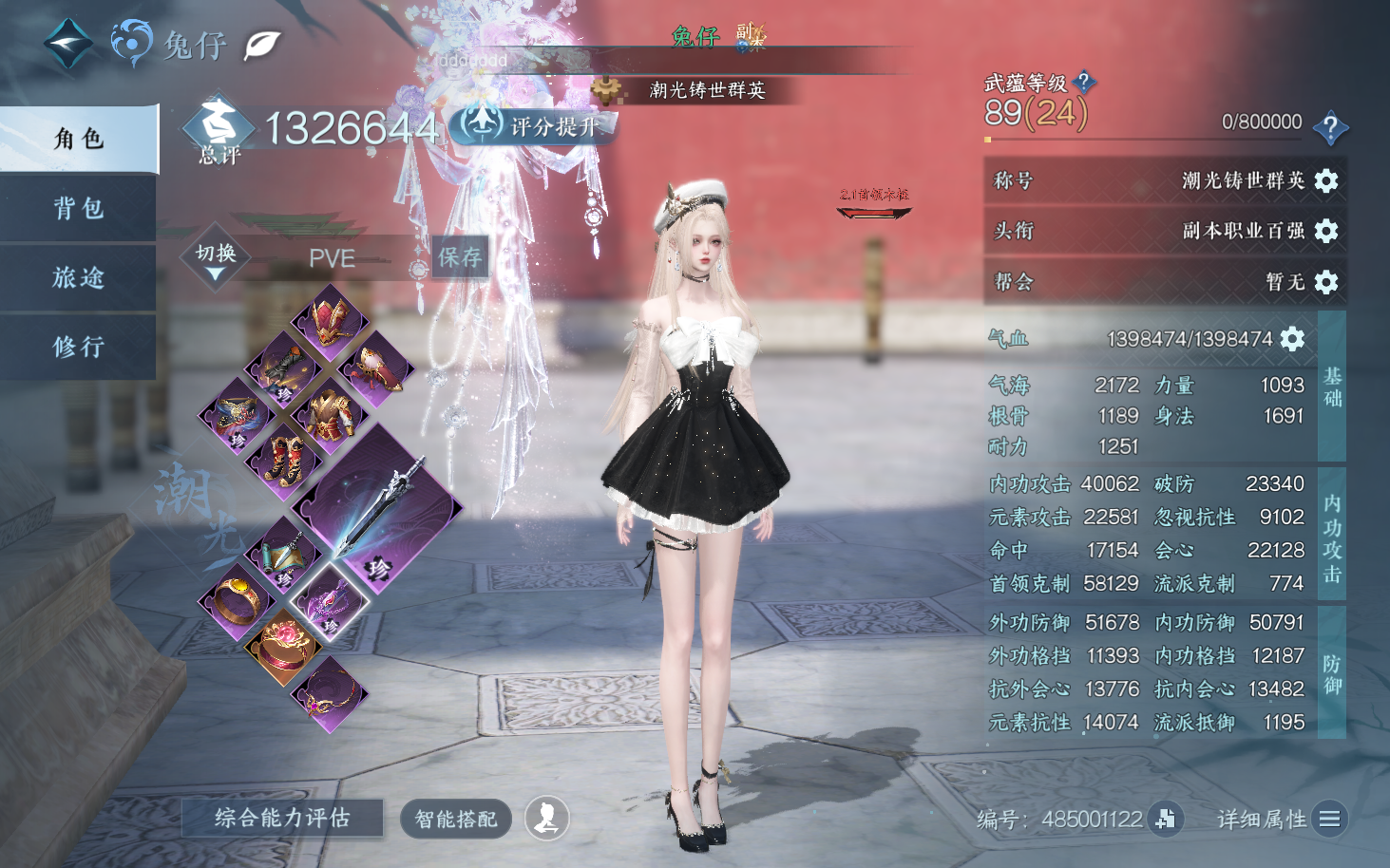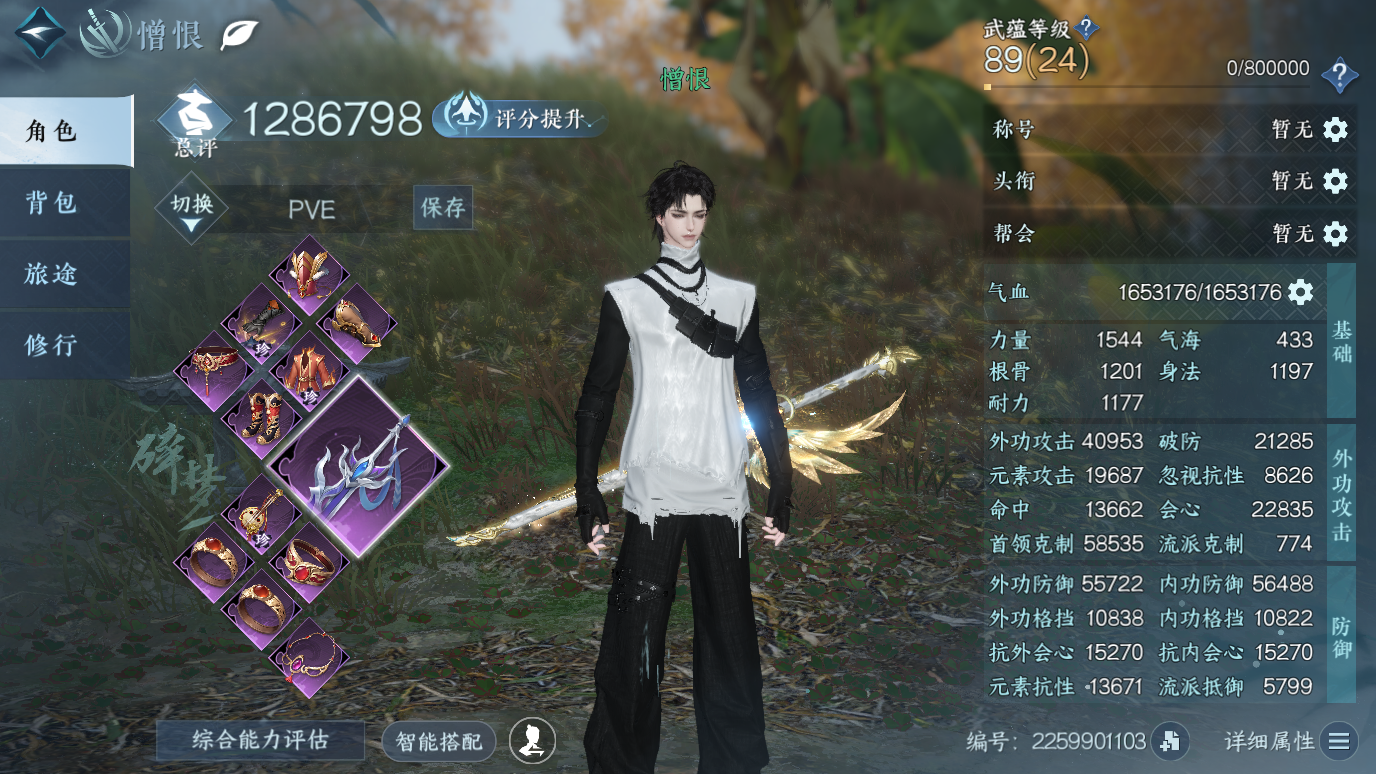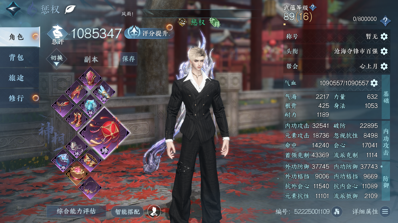 XY-076651093 战力值1384739 总评1384739 角色等级89 衣品值248570 国色值51100 已用天赏石23 未用天赏石0 天霓染数量3 【网易手机账号】 【无换绑冷却】 【玄机】 【男】 【6级】 【把酒临风】 【互通】 副本外观1 天赏外观9 天霓染2 天赏祥瑞2 天赏灵宠1 祥瑞坐骑34 商城外观44 副本外观:白夜拂雪; 天赏外观:鳞川,墨狩,无双,泽明,风华,浮云山,火焰武器,雷霆武器,绯烟香袅; 天霓染:耀光*1,迢迢霄汉*1; 天赏祥瑞:月川灵,流光溯; 天赏灵宠:灵宠·天狼星; 祥瑞坐骑:纵风甲车·赤,呆宝,布丁,假面,风行·江湖景,风行·世间情,风行·万灯明,龙衔瑞焰,金冠鼠鼠,纵风甲车·玄,粉黛娇,幻琉晶,星河转·银昼,星河转·金夕,骋风叱焰,抟乌镇妖,伯力,瓜皮,墨流云·玄色,奔虹赤,彩虹小马,木小马,银砂素波,犬威哮月,犬威哮月·沧,腾云逐日,梅香团子,绒绒夜,牛奶酥,隐云涧,西部驴仔,侠道游,逍遥游,空山闲; 商城外观:寂雾藏影,雾蓝星瞳,逸夏浮澜,羽信絮梦,谜踪神探,曙光探影,冥渊,惜金纳缘,紫渊龙堂,云极天穹,白凤御羽,诗剑纵歌,跃动心芒,朔雪从风,灼金喵影,灵语星彩,狼原灰骑,晴蓝逸思,暮夜陷落,雕骨琢心,悬蛛结心,晴岸涛吟,不负卿愿,白露惑心,玄喵夜行,鳞纱幻海,鳞骨逢幽,贪狼摄星,开阳执戈,衣香鬓影,玉泽凌烟,金粉绮梦,烽火浮生,赤狐魅语,圣月沉夜,醉墨狂歌,天纵恒尊,林泽仙踪,广寒遗客,白灵幻尘,对影邀月,迢迢霄汉,暮云苍野,轻功诀天马;