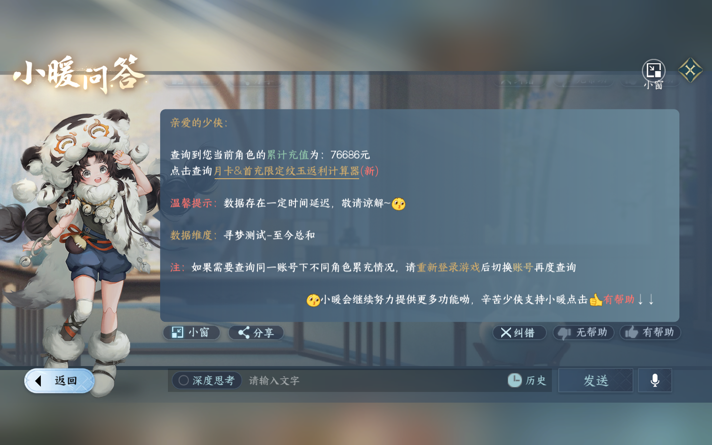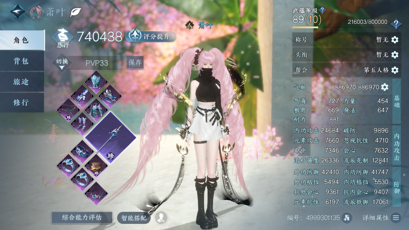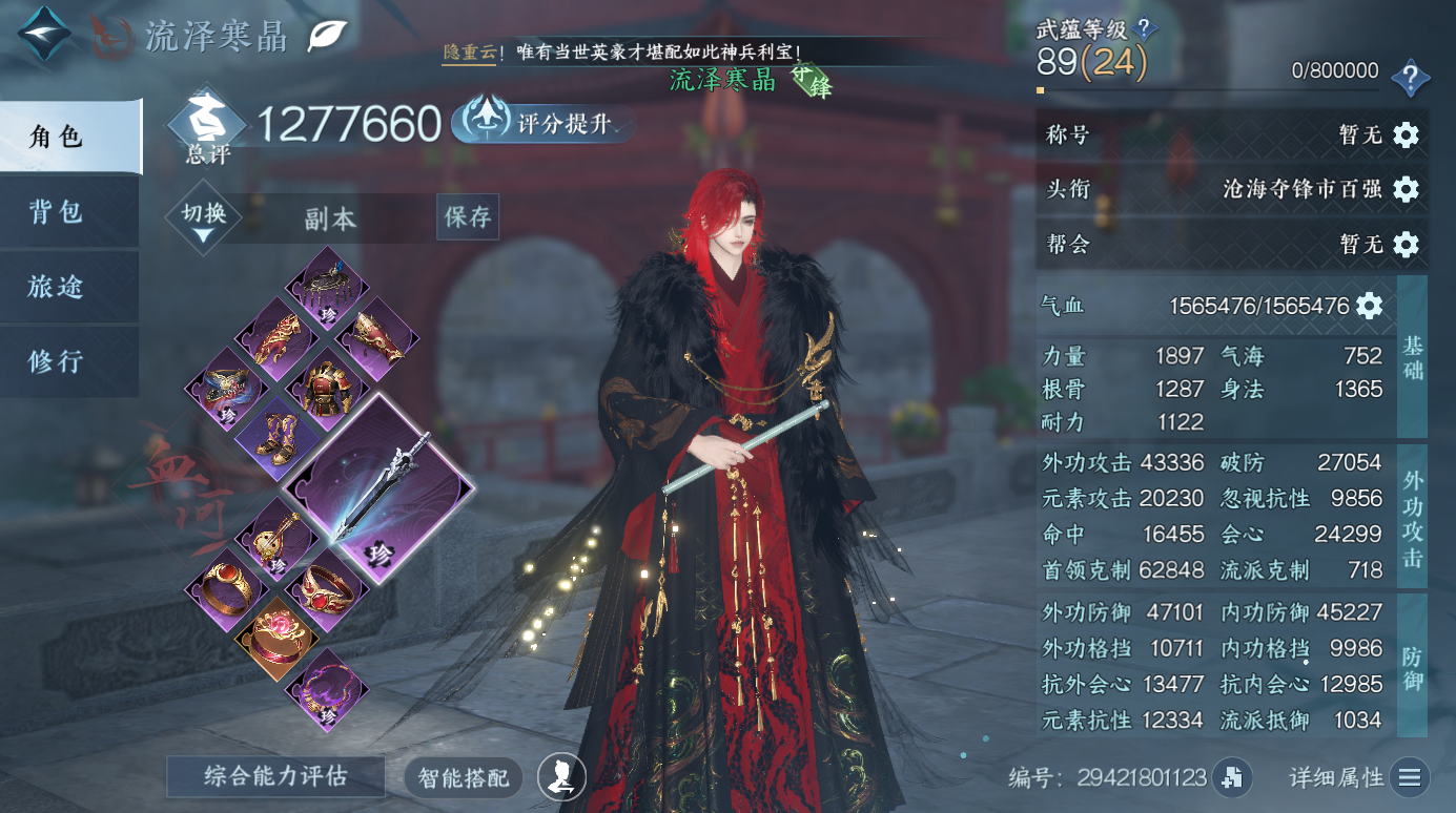XY-076648289 战力值833100 总评833100 角色等级89 衣品值207805 国色值64560 已用天赏石9 天霓染数量1 【网易手机账号】 【有换绑冷却】 【素问】 【女】 【5级】 【把酒临风】 【互通】 转盘外观2 天赏外观6 天霓染1 祥瑞坐骑39 商城外观61 武器环身1 配饰3 转盘外观:连霏,旋悠光; 天赏外观:绯曜,琴心,絮粉,琼池仙露,臻狐,琼海; 天霓染:倾心*1; 祥瑞坐骑:呆宝,布丁,风行·谦谦有礼,风行·冷香萦,金冠鼠鼠,粉黛娇,幻琉晶,狂霸天,骋风叱焰,伯力,咩郎,瓜皮,奔虹赤,云络,萌莓,风行·江湖景,风行·世间情,风行·万灯明,龙衔瑞焰,纵风甲车·赤,星河转·银昼,星河转·赤夜,贺岁喜狮,霸霸,墨流云·玄色,墨流云·朱红,墨流云·靛青,彩虹小马,木小马,犬威哮月·沧,牛奶酥,玉霄飞练,梅香团子,绒绒夜,隐云涧,西部驴仔,侠道游,逍遥游,空山闲; 商城外观:雪团云绒,金筹曜夜,羽信絮梦,幽蝶魅影,幻音星缘,暗蔷魅影,音律织光,幽梦逢她,碎玉怜姻,云梦萤星,焕曜旋煌,紫霄云旗,司命秋罗,海月漫歌,曦凤嘉煌,绯夜誓语,鸿福昭运,灵娲泽生,神戬天威,朝歌旧梦,天籁闻歌,晶梦绮舞,闻鹤九皋,跃动心芒,朔雪从风,逍遥千风,灵语星彩,幻梦巡礼,绯月狼舞,白夜俘获,凤亭疏香,温语愈心,芳汀花影,空冥铃语,云汉逢夕,斗墨金枢,玄喵夜行,鳞纱幻海,鳞骨逢幽,贪狼摄星,青林雀舞,开阳执戈,衣香鬓影,混天焚莲,瀚渊龙炎,金祷昼梦,金粉绮梦,烽火浮生,赤狐魅语,圣月澄空,天纵红颜,林泽清瑶,广寒游仙,白灵雪魅,青玉引,对影邀月,墨隐千秋,枫华九霄,青溪春信,迷迭萧疏,白羽武器; 武器环身:剑渡东海; 配饰:藏月迷晖,陌野萤梦,启明白羽;逆水寒手游 - 凌西川 -