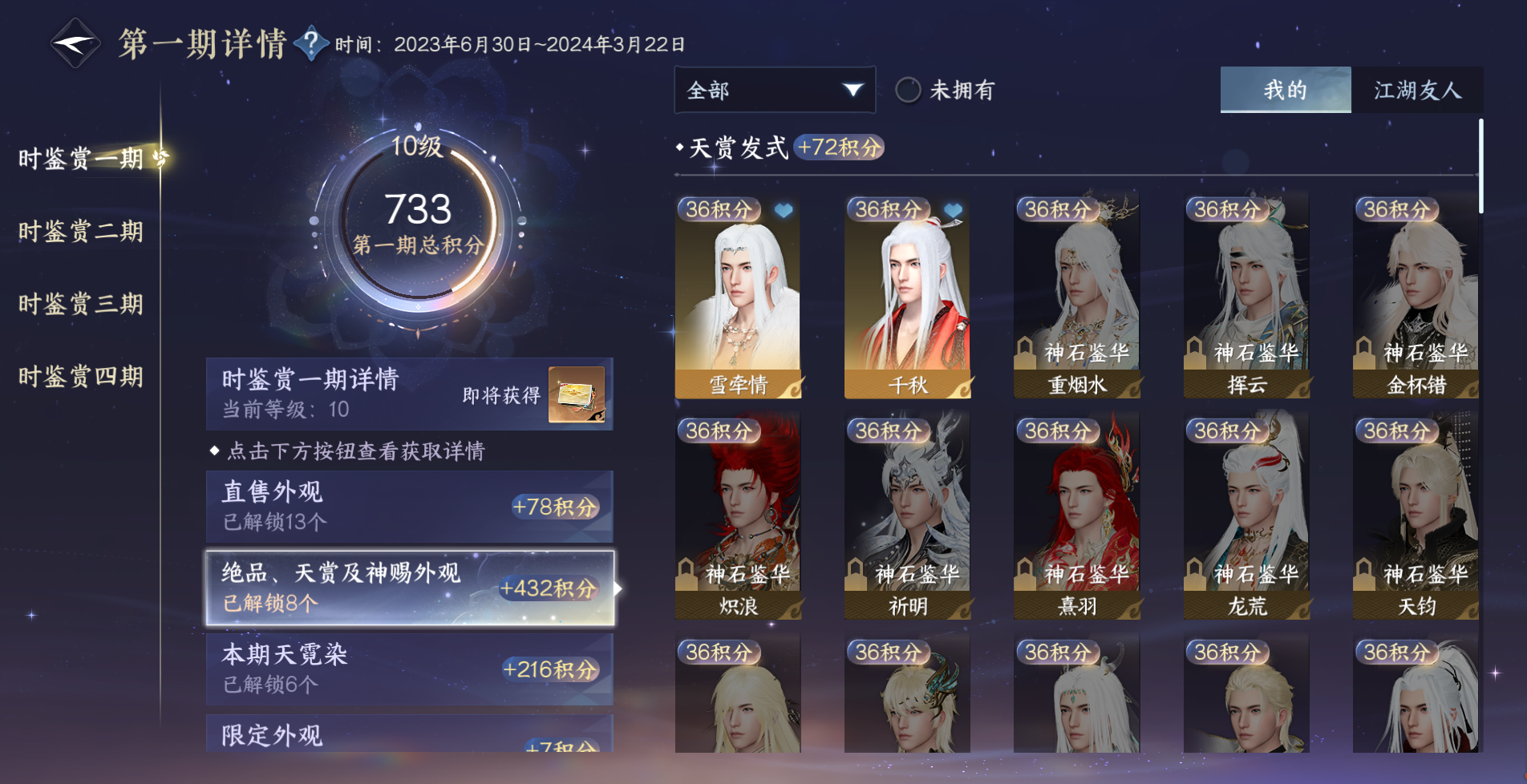 XY-076644274 【已用天赏石13】天霓染1,转盘外观2,副本外观4,馆藏4级,灵韵11,34380国色,197485衣品,165套时装,装备特技14金,庄园等级13级逆水寒手游 - 踏北尘 -
