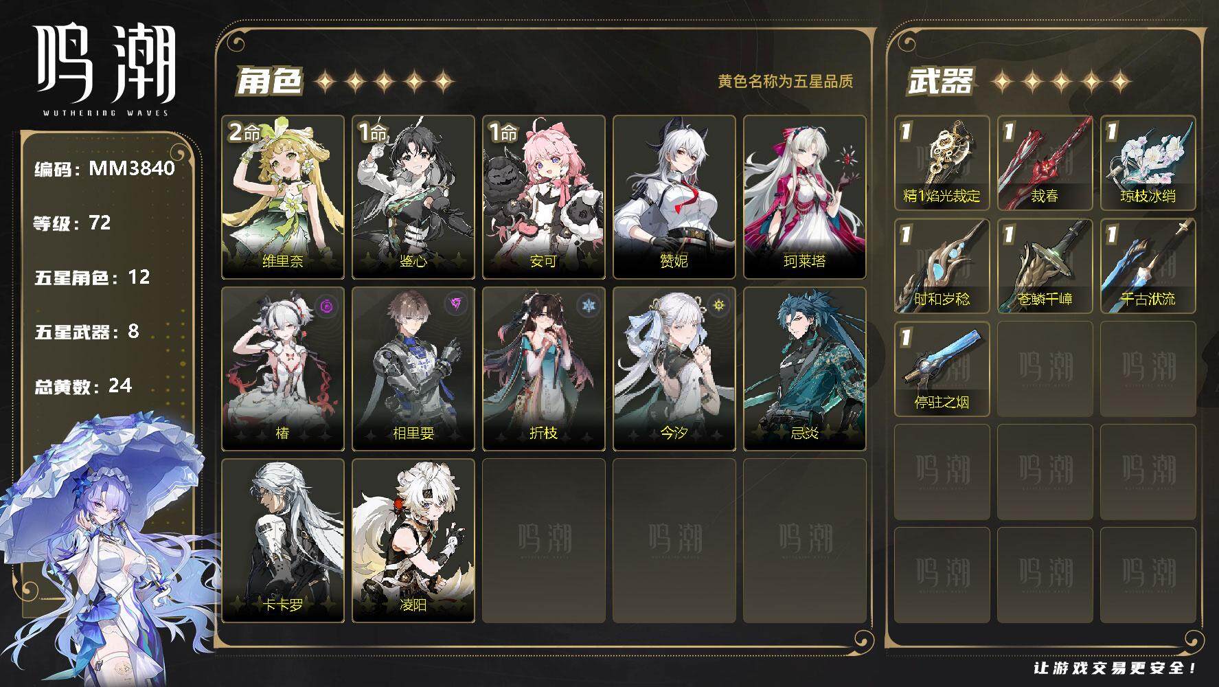 [10236975]【MM3840】【MF2876 0+1赞妮 0+1今汐 0+1椿 0+1折枝 0+1忌炎 珂莱塔 相里要】72级/24黄/男主/12个五星角色/8个五星武器未绑定,赞妮,珂莱塔,椿,相里要,折枝,今汐,忌炎,维里奈,鉴心,卡卡罗,安可,凌阳,焰光裁定,裁春,琼枝冰绡,时和岁稔,苍鳞千嶂,千古洑流,停驻之烟,2命维里奈,1命鉴心,1命安可,0命赞妮,0命珂莱塔,0命椿,0命相里要,0命折枝,0命今汐,0命忌炎,0命卡卡罗,0命凌阳,精1焰光裁定,精1裁春,精1琼枝冰绡,精1时和岁稔,精1苍鳞千嶂,精1千古洑流,精1停驻之烟鸣潮 - 官服 -