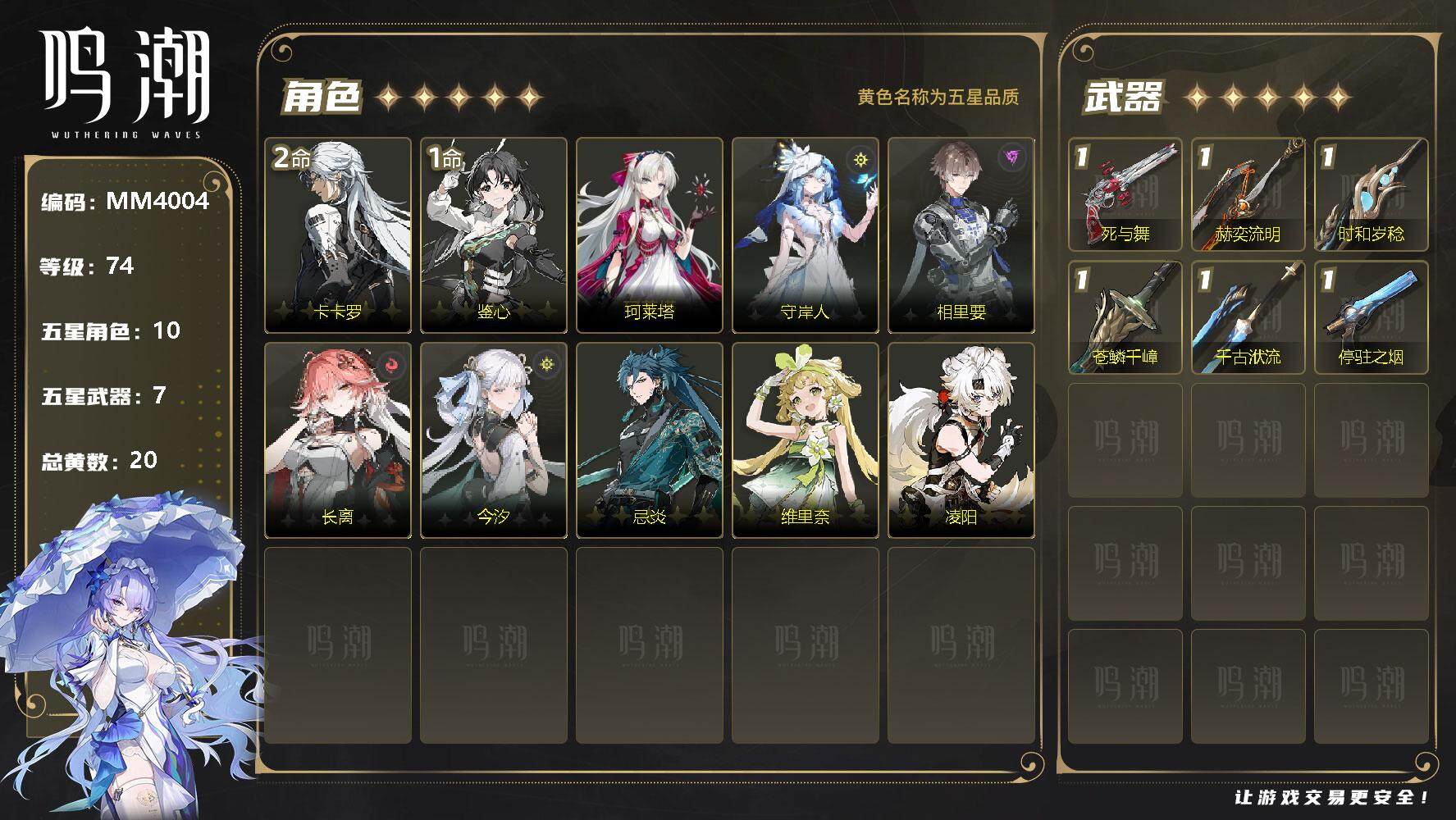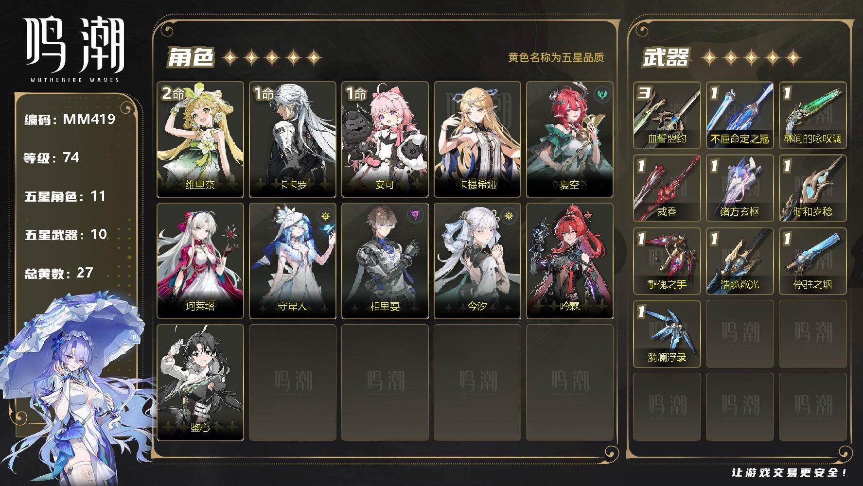 [10566771]【MM419】【MF4064】74级/27黄/男主/11个五星角色/10个五星武器未绑定,卡提希娅,夏空,珂莱塔,守岸人,相里要,今汐,吟霖,维里奈,鉴心,卡卡罗,安可,不屈命定之冠,林间的咏叹调,血誓盟约,裁春,诸方玄枢,时和岁稔,掣傀之手,浩境粼光,停驻之烟,漪澜浮录,2命维里奈,1命卡卡罗,1命安可,0命卡提希娅,0命夏空,0命珂莱塔,0命守岸人,0命相里要,0命今汐,0命吟霖,0命鉴心,精3血誓盟约,精1不屈命定之冠,精1林间的咏叹调,精1裁春,精1诸方玄枢,精1时和岁稔,精1掣傀之手,精1浩境粼光,精1停驻之烟,精1漪澜浮录鸣潮 - 官服 -