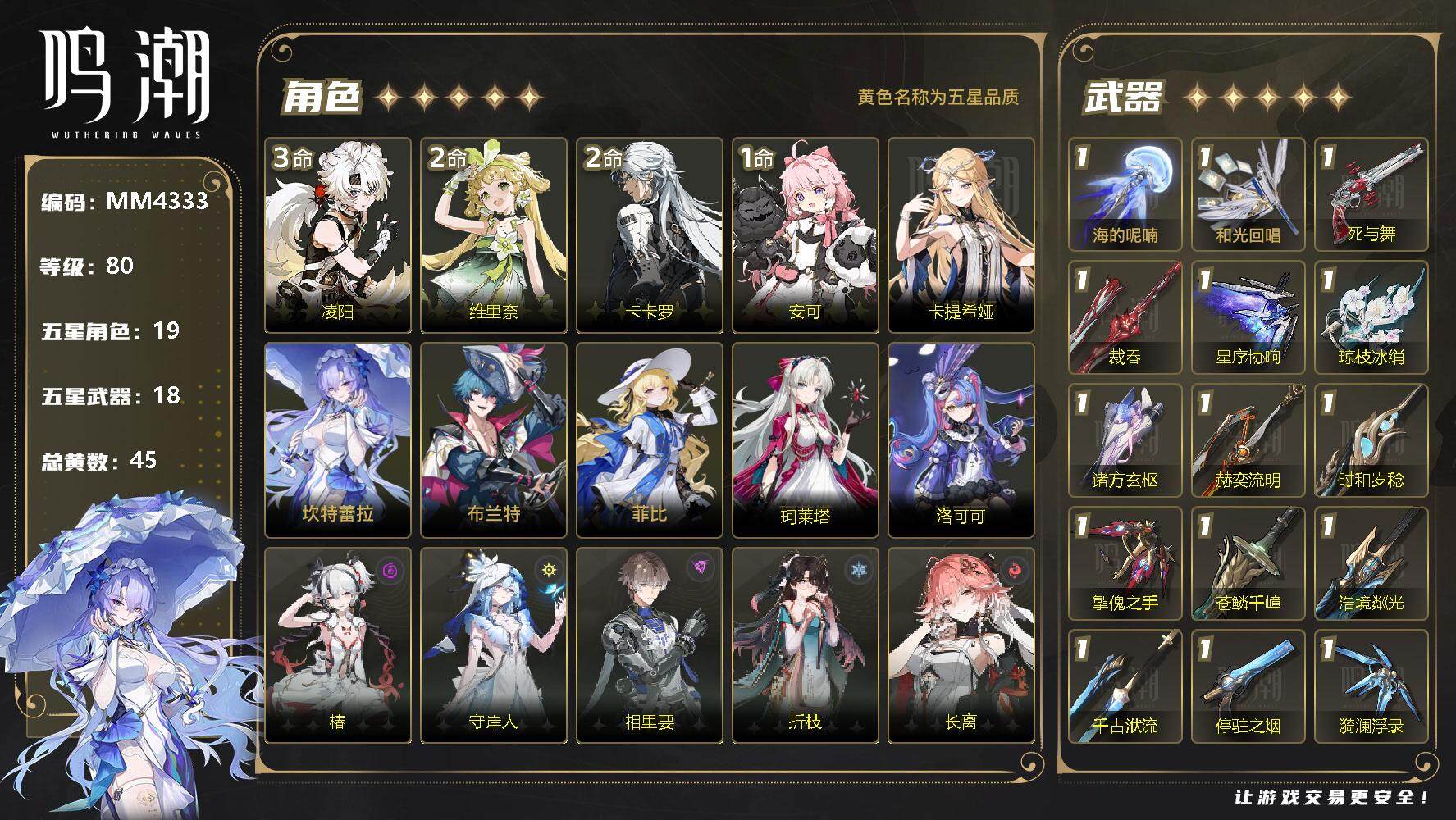 [10919569]【MM4333】【MF3397 送散华 今汐皮肤】80级/45黄/男主/19个五星角色/18个五星武器未绑定,卡提希娅,坎特蕾拉,布兰特,菲比,珂莱塔,洛可可,椿,守岸人,相里要,折枝,长离,今汐,吟霖,忌炎,维里奈,鉴心,卡卡罗,安可,凌阳,海的呢喃,和光回唱,死与舞,裁春,星序协响,琼枝冰绡,诸方玄枢,赫奕流明,时和岁稔,掣傀之手,苍鳞千嶂,浩境粼光,千古洑流,停驻之烟,漪澜浮录,3命凌阳,2命维里奈,2命卡卡罗,1命安可,0命卡提希娅,0命坎特蕾拉,0命布兰特,0命菲比,0命珂莱塔,0命洛可可,0命椿,0命守岸人,0命相里要,0命折枝,0命长离,0命今汐,0命吟霖,0命忌炎,0命鉴心,精1海的呢喃,精1和光回唱,精1死与舞,精1裁春,精1星序协响,精1琼枝冰绡,精1诸方玄枢,精1赫奕流明,精1时和岁稔,精1掣傀之手,精1苍鳞千嶂,精1浩境粼光,精1千古洑流,精1停驻之烟,精1漪澜浮录鸣潮 - 官服 -