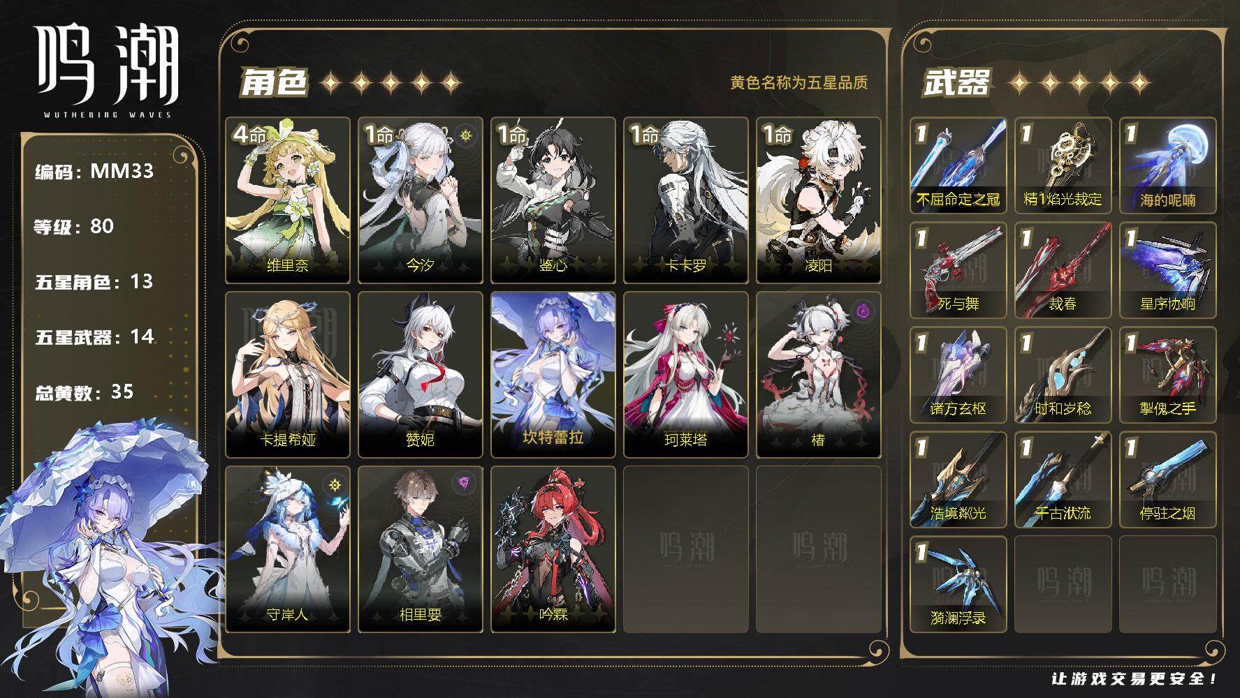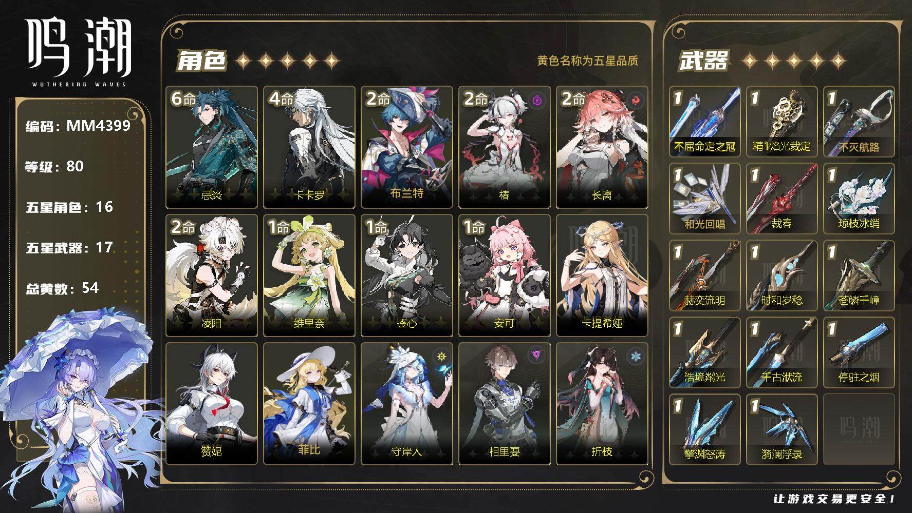 [10919071]【MM4395】【MF3464】80级/31黄/男主/14个五星角色/10个五星武器未绑定,卡提希娅,坎特蕾拉,珂莱塔,椿,守岸人,相里要,今汐,吟霖,忌炎,维里奈,鉴心,卡卡罗,安可,凌阳,不屈命定之冠,和光回唱,死与舞,裁春,星序协响,时和岁稔,苍鳞千嶂,停驻之烟,漪澜浮录,2命凌阳,1命维里奈,1命鉴心,1命卡卡罗,0命卡提希娅,0命坎特蕾拉,0命珂莱塔,0命椿,0命守岸人,0命相里要,0命今汐,0命吟霖,0命忌炎,0命安可,精1不屈命定之冠,精1和光回唱,精1死与舞,精1裁春,精1星序协响,精1时和岁稔,精1苍鳞千嶂,精1停驻之烟,精1漪澜浮录鸣潮 - 官服 -
