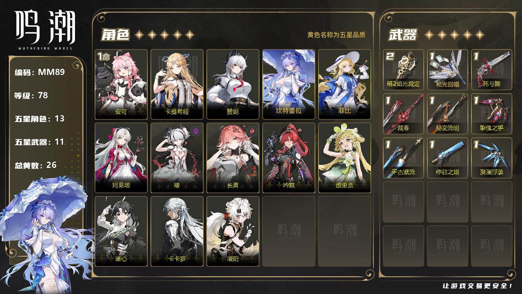 [11130300]【MM89】【MF3711 】78级/26黄/男主/13个五星角色/11个五星武器未绑定,卡提希娅,赞妮,坎特蕾拉,菲比,珂莱塔,椿,长离,吟霖,维里奈,鉴心,卡卡罗,安可,凌阳,焰光裁定,血誓盟约,和光回唱,死与舞,裁春,赫奕流明,掣傀之手,千古洑流,停驻之烟,漪澜浮录,1命安可,0命卡提希娅,0命赞妮,0命坎特蕾拉,0命菲比,0命珂莱塔,0命椿,0命长离,0命吟霖,0命维里奈,0命鉴心,0命卡卡罗,0命凌阳,精2焰光裁定,精1血誓盟约,精1和光回唱,精1死与舞,精1裁春,精1赫奕流明,精1掣傀之手,精1千古洑流,精1停驻之烟,精1漪澜浮录