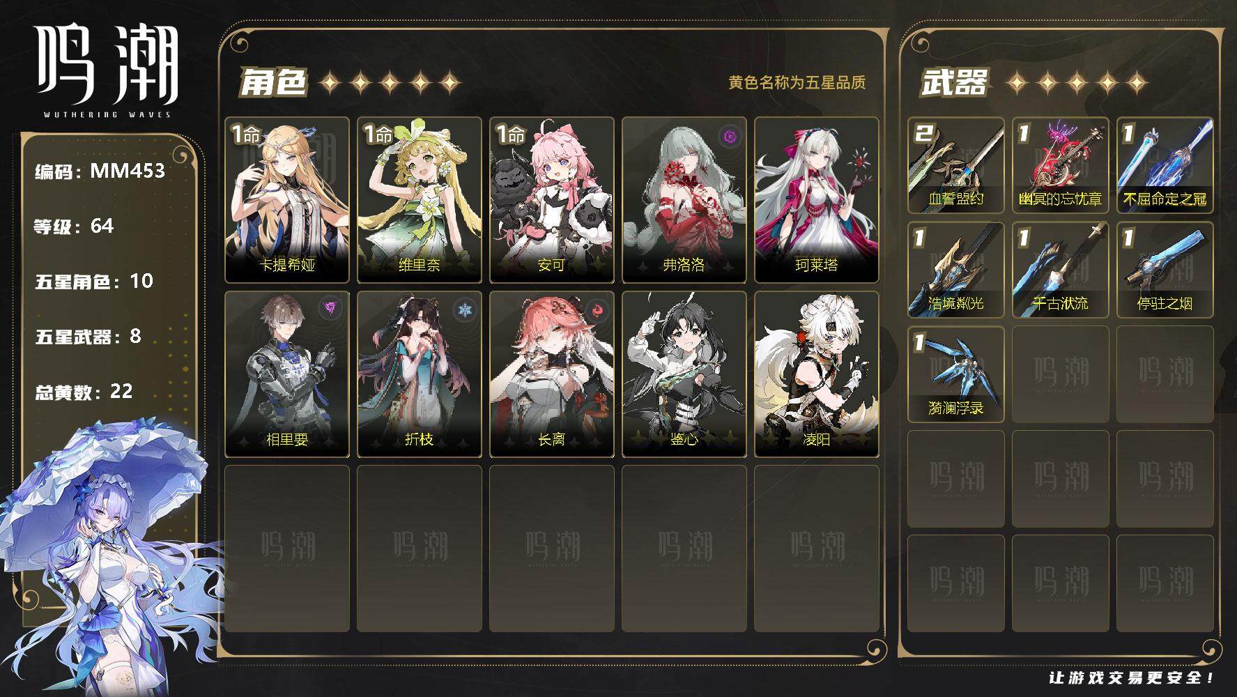 [10626285]【MM453】64级/22黄/女主/10个五星角色/8个五星武器未绑定,弗洛洛,卡提希娅,珂莱塔,相里要,折枝,长离,维里奈,鉴心,安可,凌阳,幽冥的忘忧章,不屈命定之冠,血誓盟约,浩境粼光,千古洑流,停驻之烟,漪澜浮录,1命卡提希娅,1命维里奈,1命安可,0命弗洛洛,0命珂莱塔,0命相里要,0命折枝,0命长离,0命鉴心,0命凌阳,精2血誓盟约,精1幽冥的忘忧章,精1不屈命定之冠,精1浩境粼光,精1千古洑流,精1停驻之烟,精1漪澜浮录鸣潮 - 官服 -