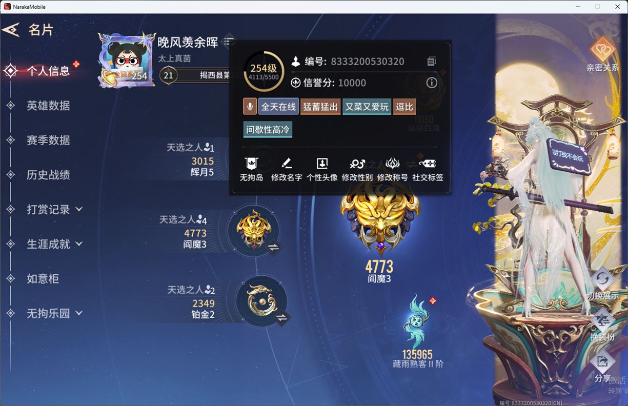 AK6065/网易手机/11月29可换绑/三人段位蚀月3/13红/398金/声望16/春木/神君印/炎烈珠/少阳剑/帝星/龙雀/飞将戟/狂龙/苍穹之光/赤皓新囍/化生明王/戎金狼/狱炎烬甲/人偶之梦/沙漠香风/墨离/过江龙/亢龙/毛乎乎/暝视/无韵/雷王锯/墨绒羽扇/逍遥/竹霹雳/迎宵/悠竹萌客/兰庭月/信手斩龙/晨风/伏波龙女/黄庭道/寒芷/祸津素盏/麟鹿大铠/玉叶景/浣烟纱/卷毛/极夜天曦/赤诚心/云间影/提步/男性发型14/活动中心手机绑定无法解绑/找回包赔/永劫无间手游 - 网易官服 -