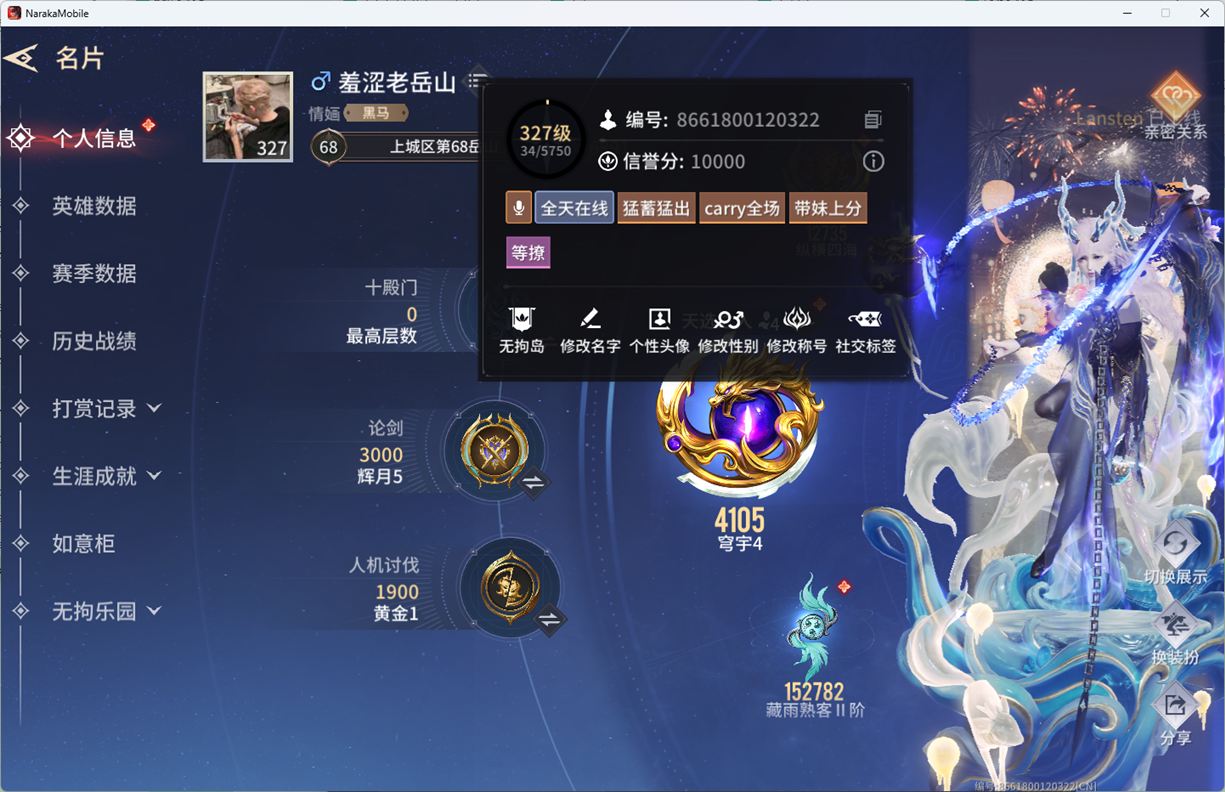 AK6080/网易手机手游/12月4可换绑/四人段位萤星5/10红/417金/凶虎/炎烈珠/御祥云/金焰狐舞/神君印/御海之灵/吉光羽/海龙吟/如意金箍棒/谪仙颂御天/霜雪狐歌/鲤梦浮光/熛怒炼火/初代玄女/戎金狼/沙漠香风/绮雀之森/掌珠仙子/午后瑰夏/高校水着/过江龙/南山翠暖/舞扇/天之刑/找回包赔/永劫无间手游 - 网易官服 -