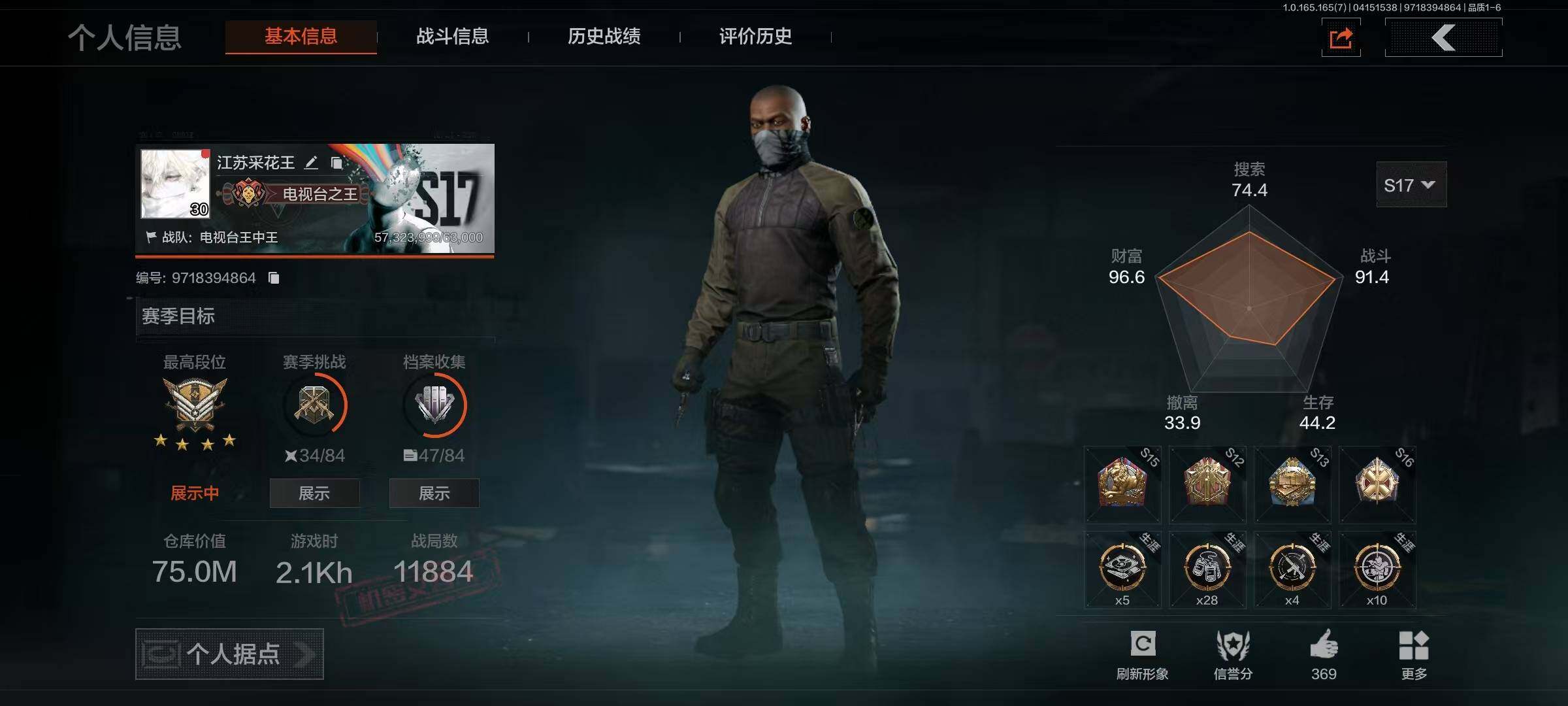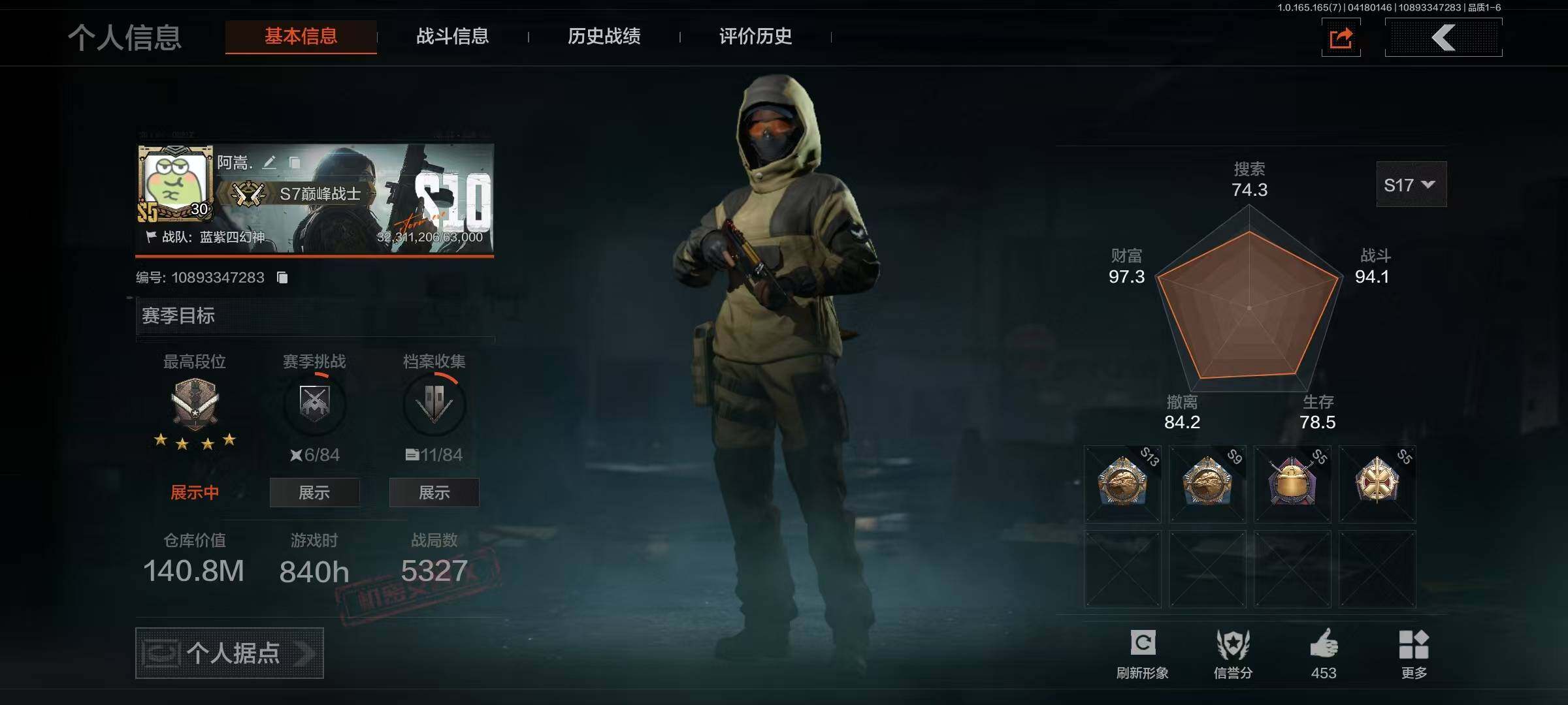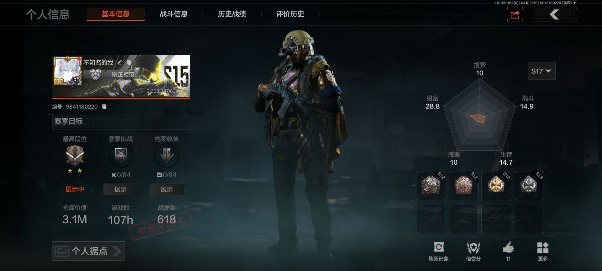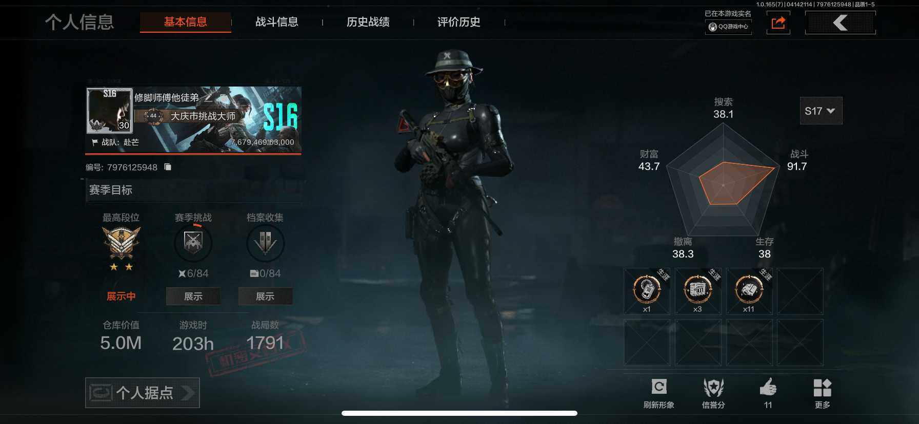 【AQN260】等级:30/段位:暗区传说/仓库价值(百万):1.4/柯恩币:0.2/寒牙手刺