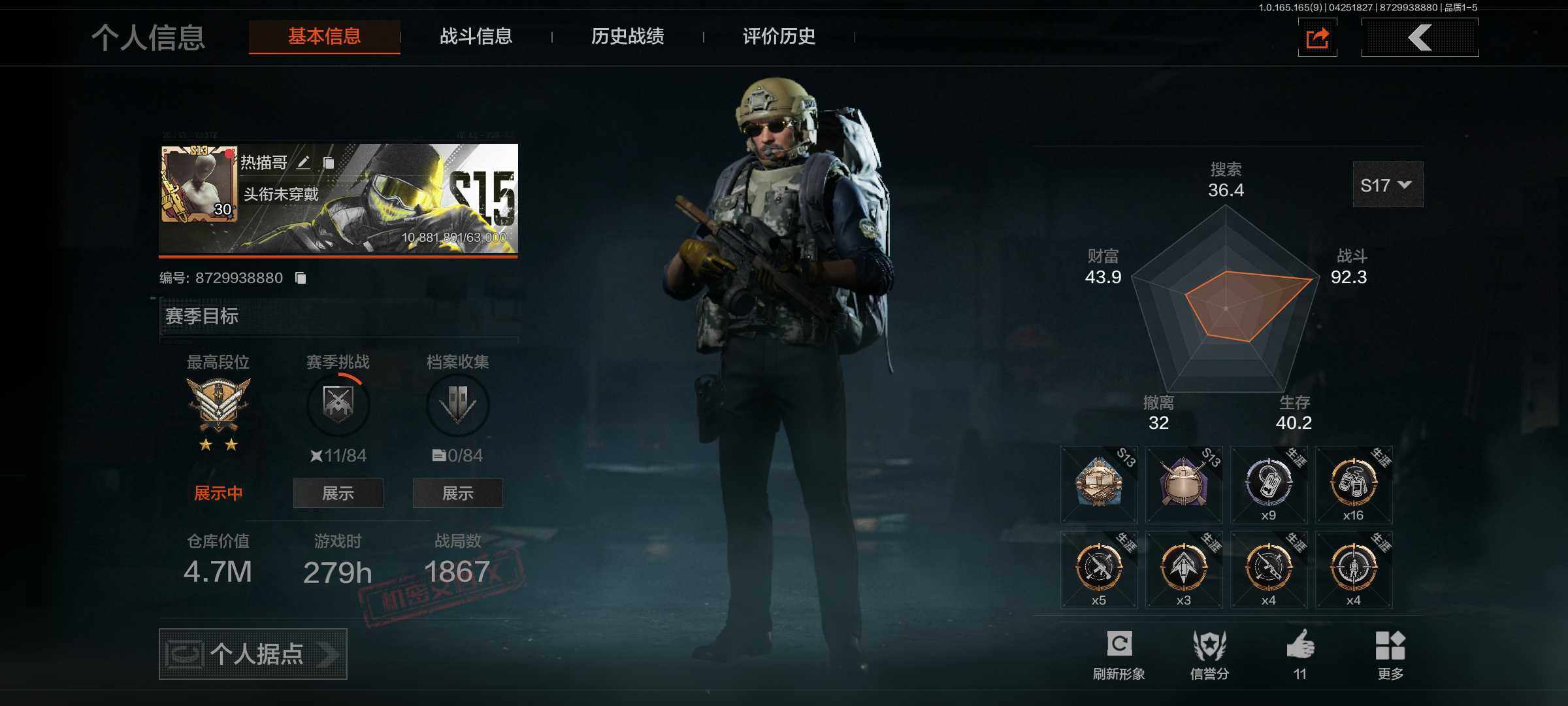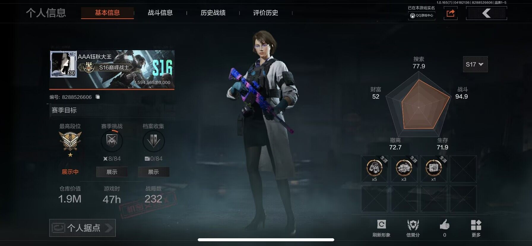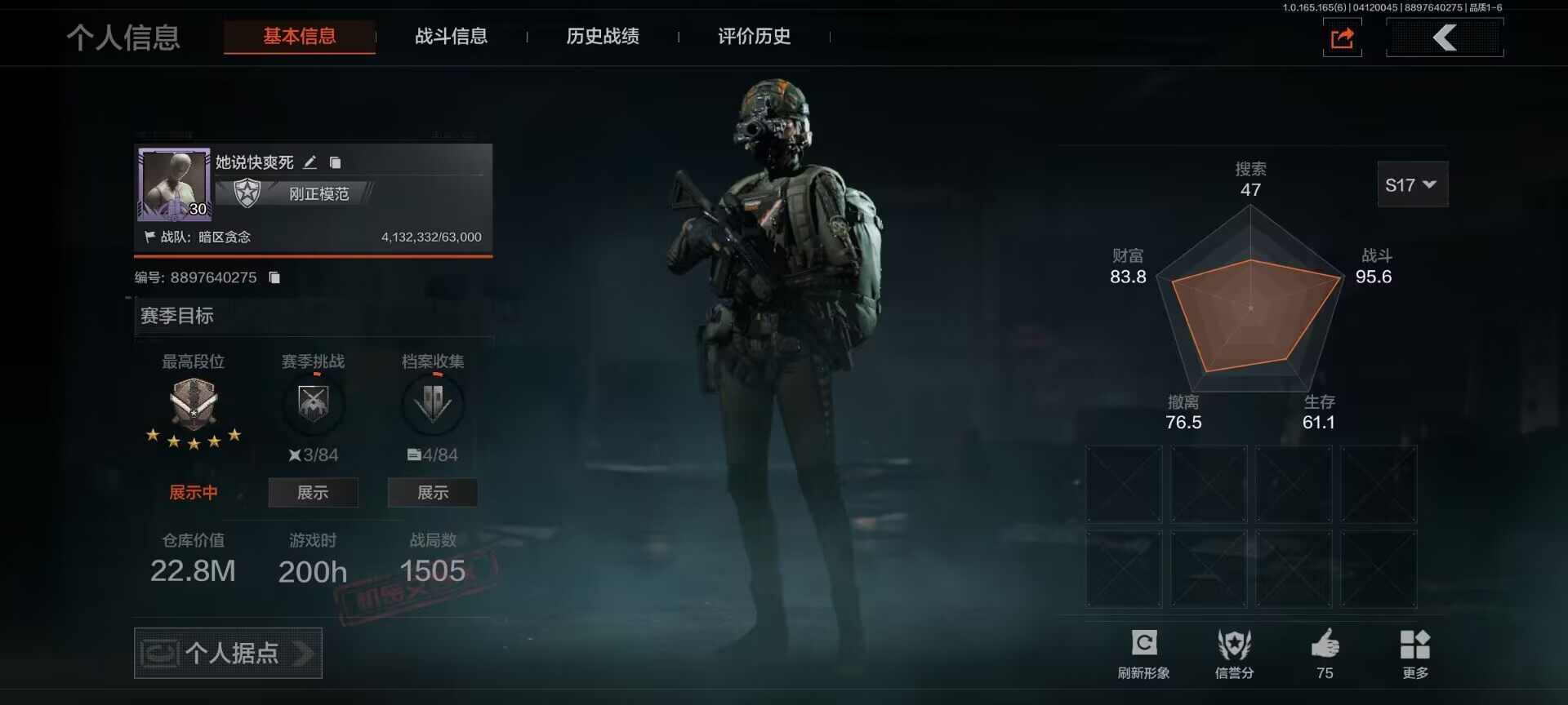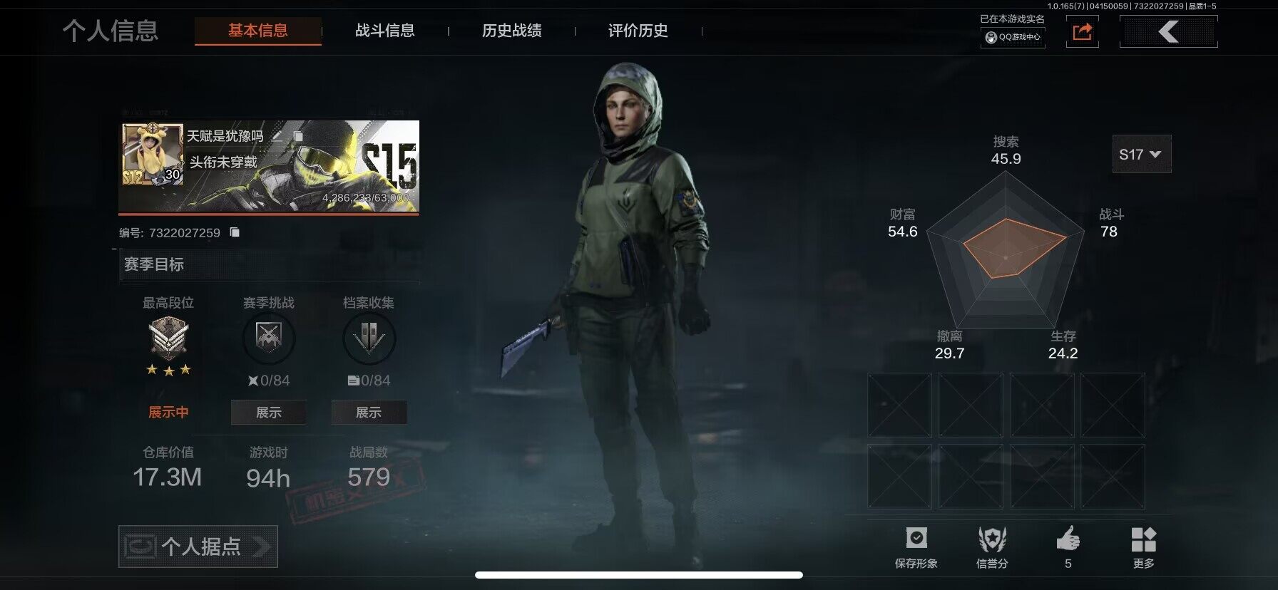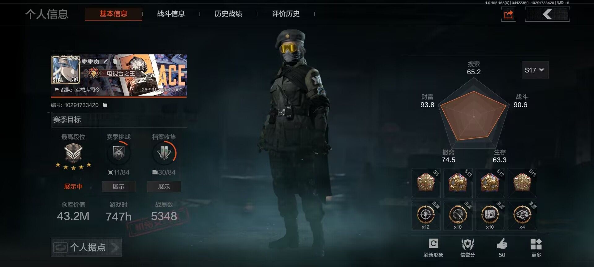 【AQD350】等级:30/段位:王牌/仓库价值(百万):252/柯恩币:143745/空腔战术/白蔷薇斯黛拉/套金客莫雷尔暗区突围 - 安卓 -